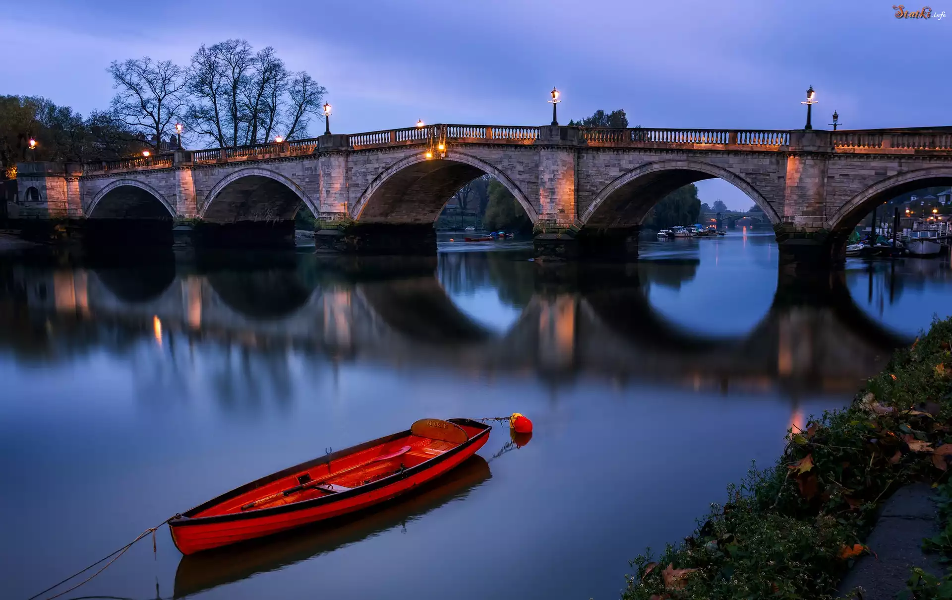 Statek Anglia, Londyn, Most Richmond, Noc, Rzeka Tamiza, Łódka