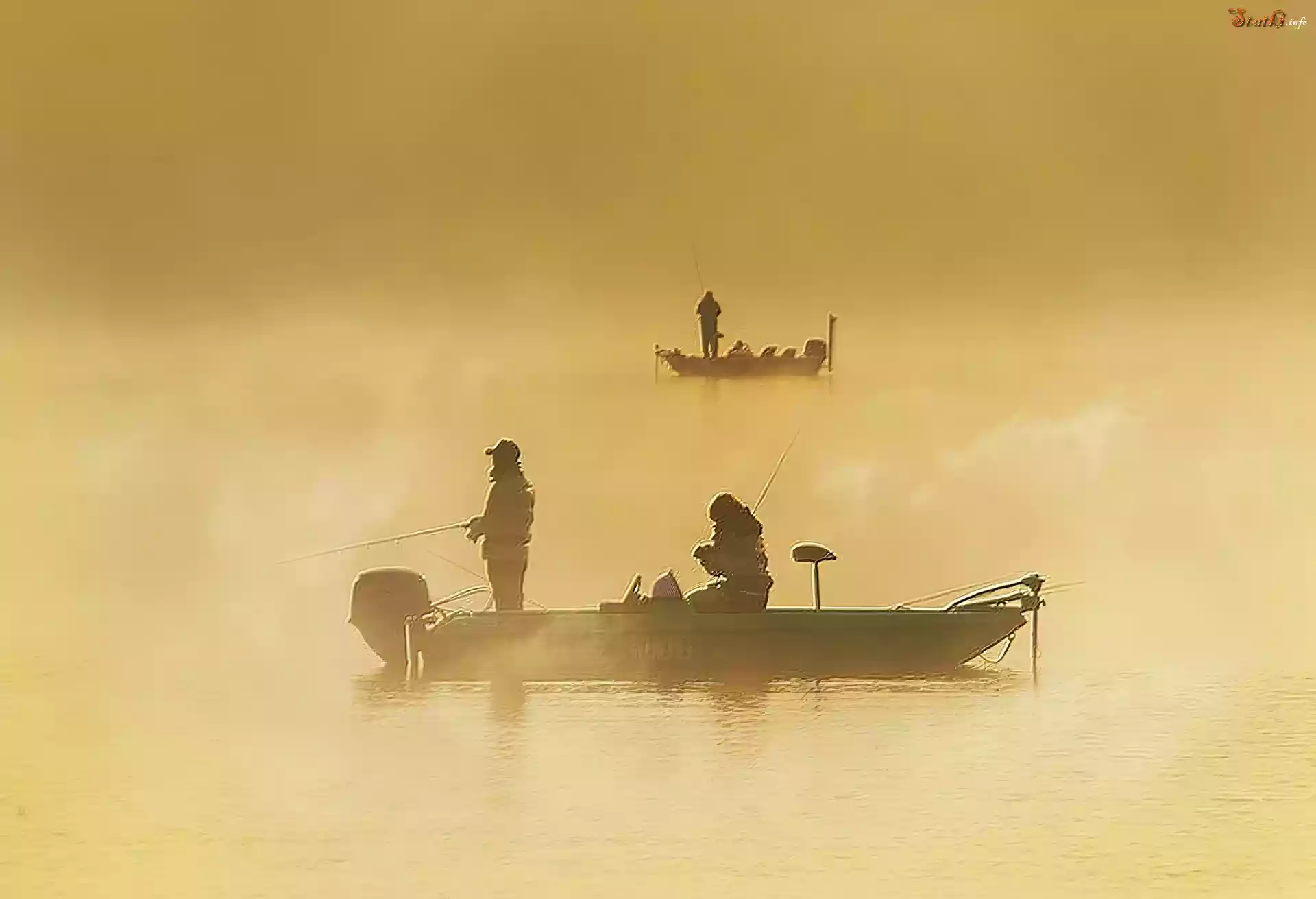 Statek Ludzie, Wędkarze, Łodzie, Woda, Mgła