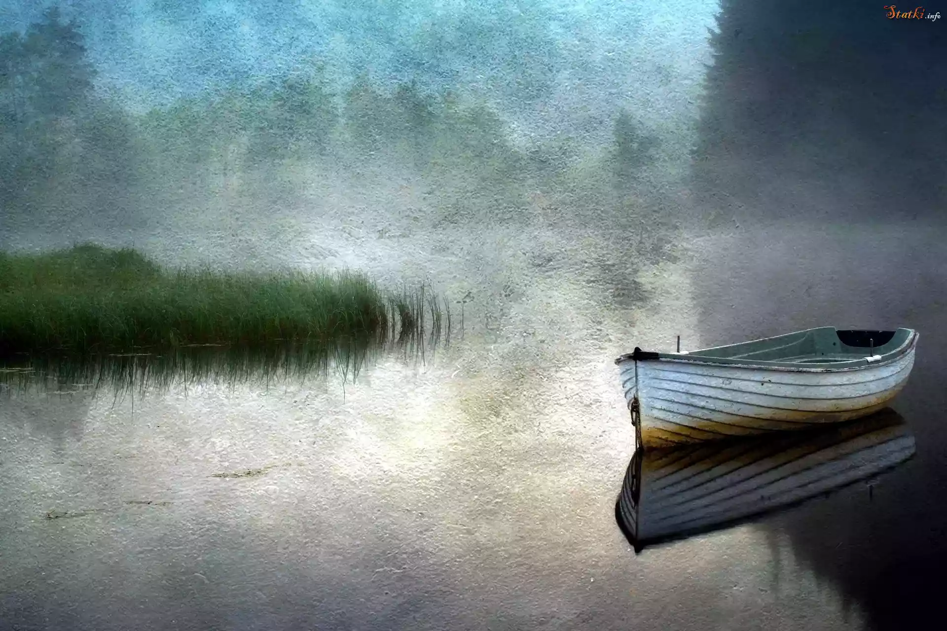 Malarstwo, Obraz, Łódka, Jezioro, Szuwary