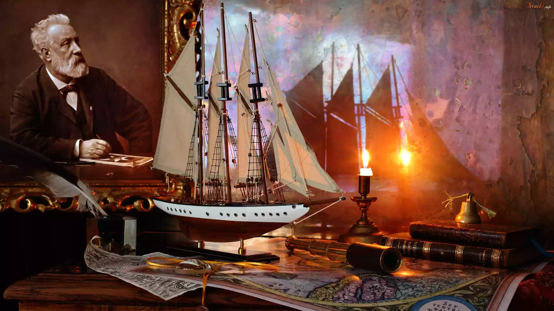 Statek Kompozycja, Obraz, Juliusz Verne, Statek, Mapa, Lornetka, Książki, Dzwonek, Świecznik, Świeca, Lupa
