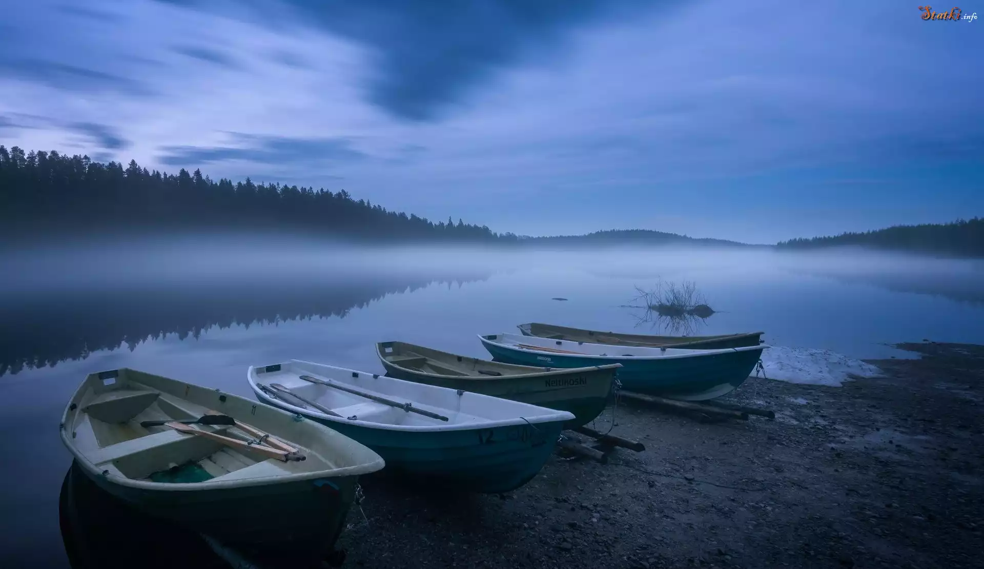Łódki, Jezioro, Mgła, Drzewa