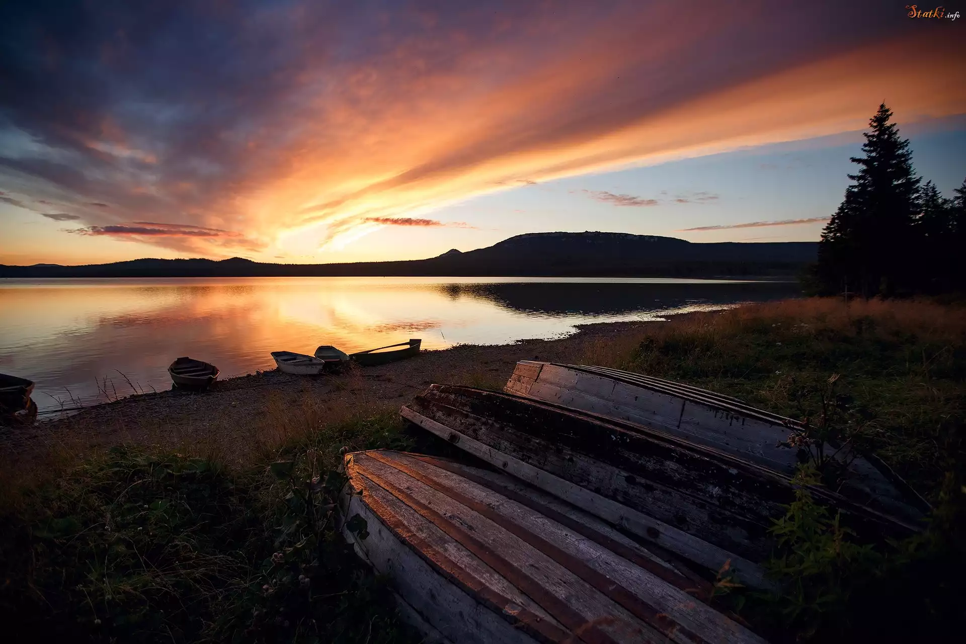 Jezioro Ziuratkul, Łódki, Zachód słońca, Mgła, Park Narodowy Ziuratkul, Obwód czelabiński, Rosja