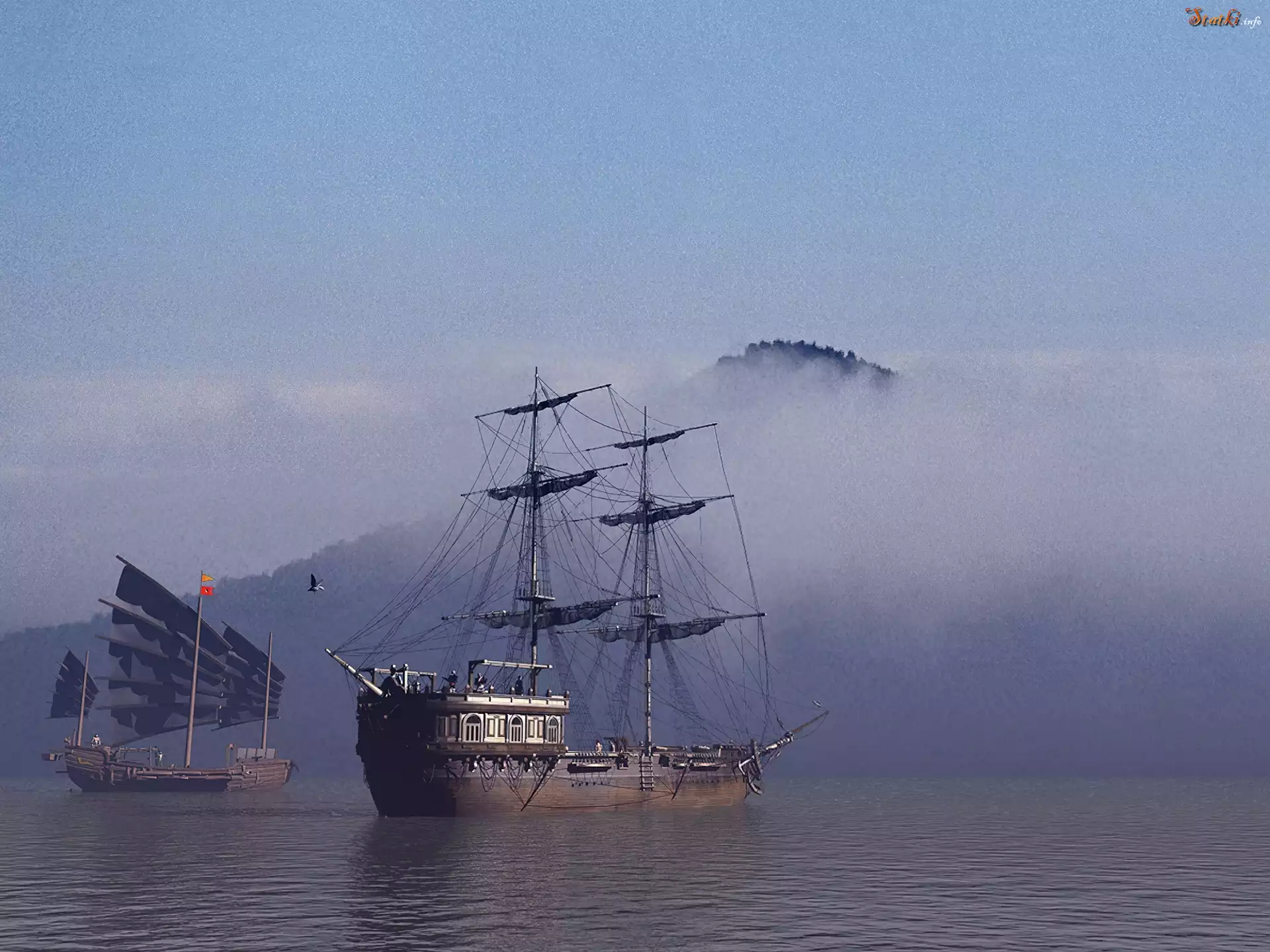 Statek Żaglowiec, Morze, Mgła, Wyspa