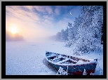 Zima, Jezioro, Ośnieżone, Drzewa, Łódka, Wschód słońca, Mgła
