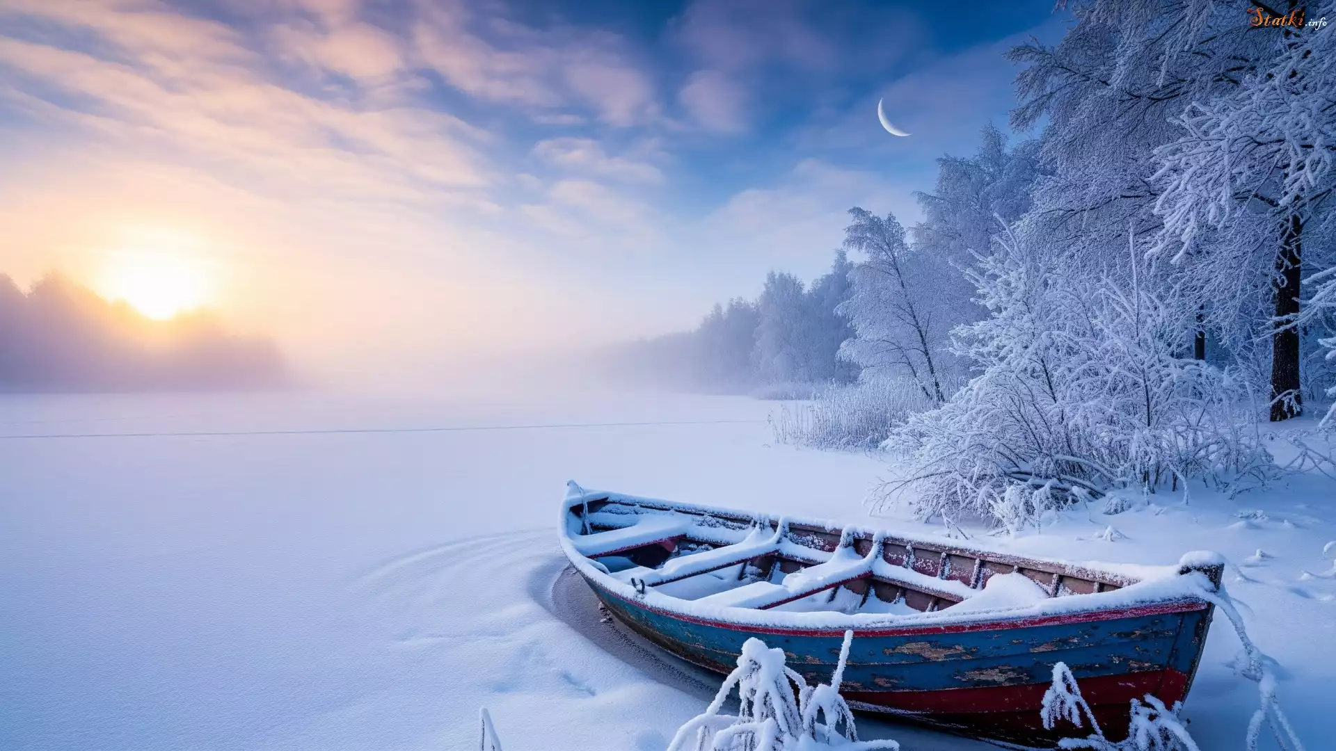 Statek Zima, Jezioro, Ośnieżone, Drzewa, Łódka, Wschód słońca, Mgła