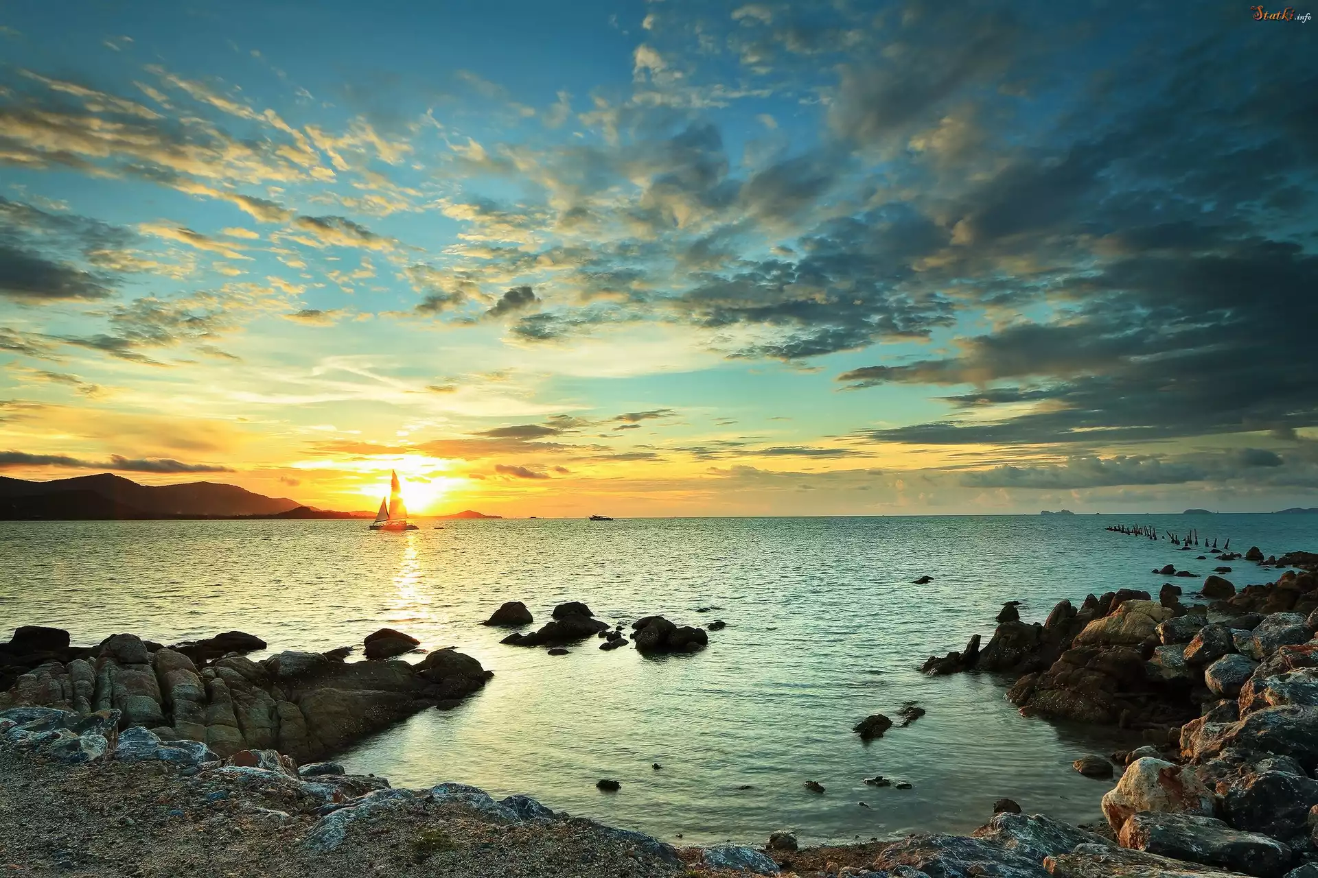 Morze, Żaglówka, Zachód słońca, Chmury, Kamienie