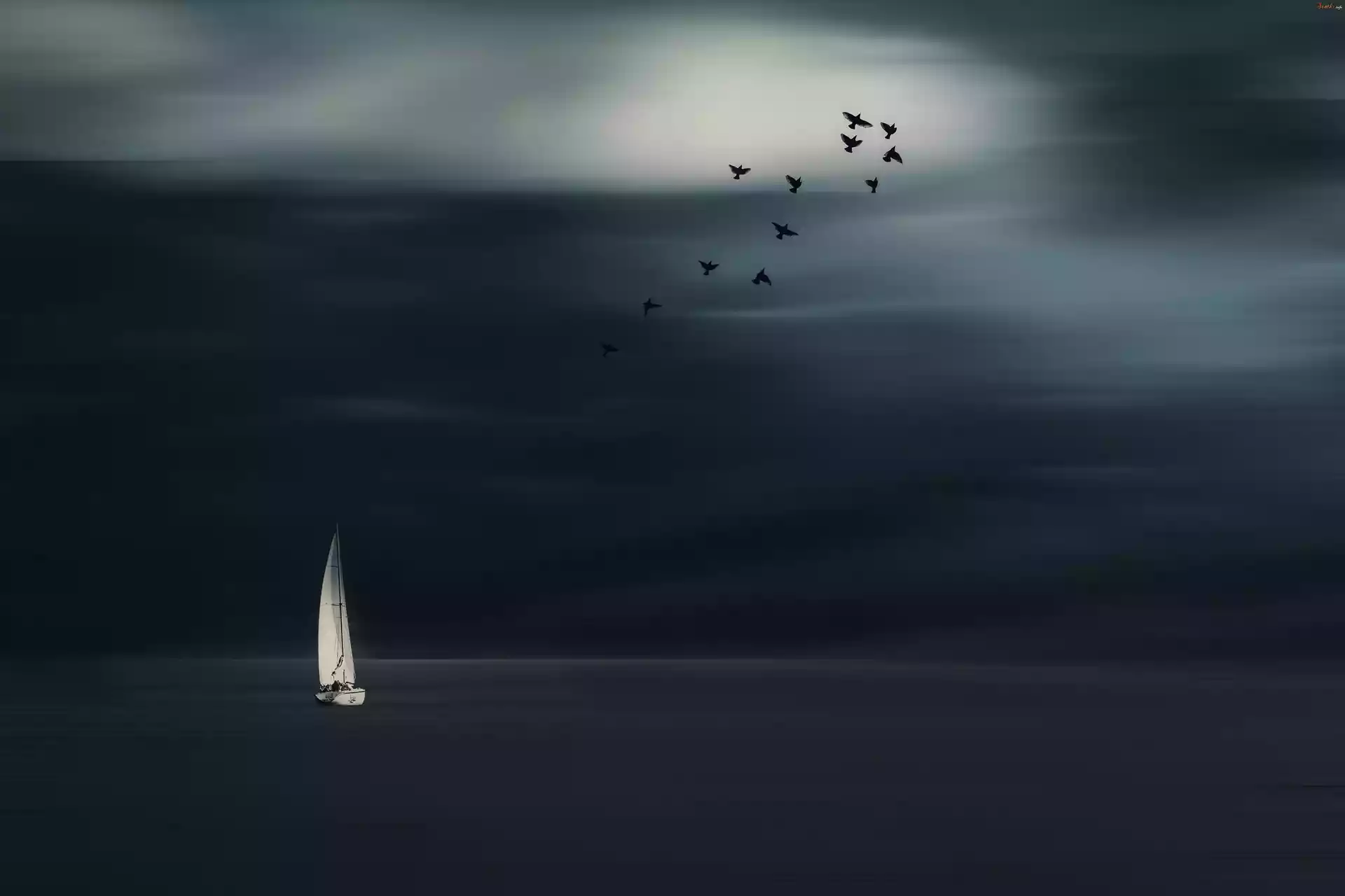 Morze, Żaglówka, Ptaki , Czarno-Białe