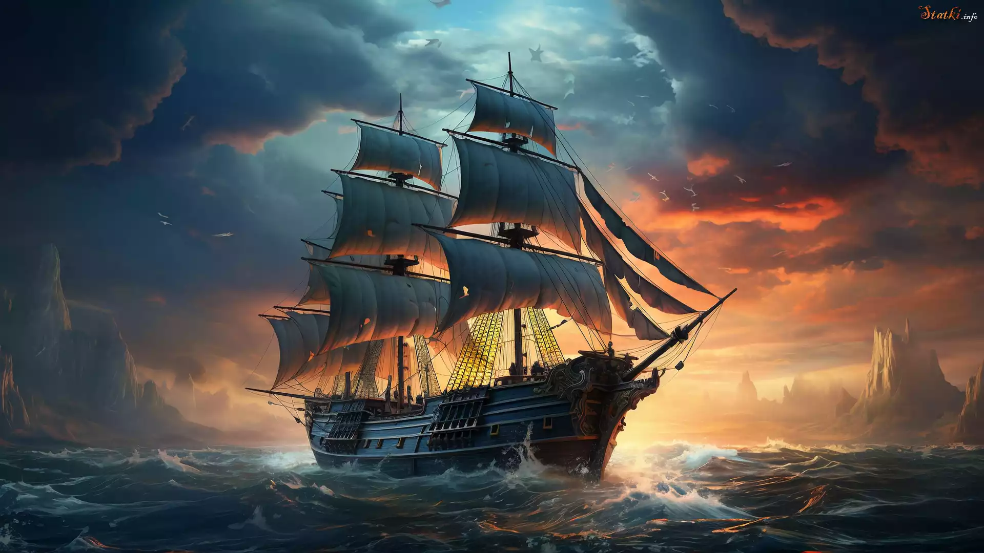 Statek Żaglowiec, Morze, Fale, Chmury, Grafika