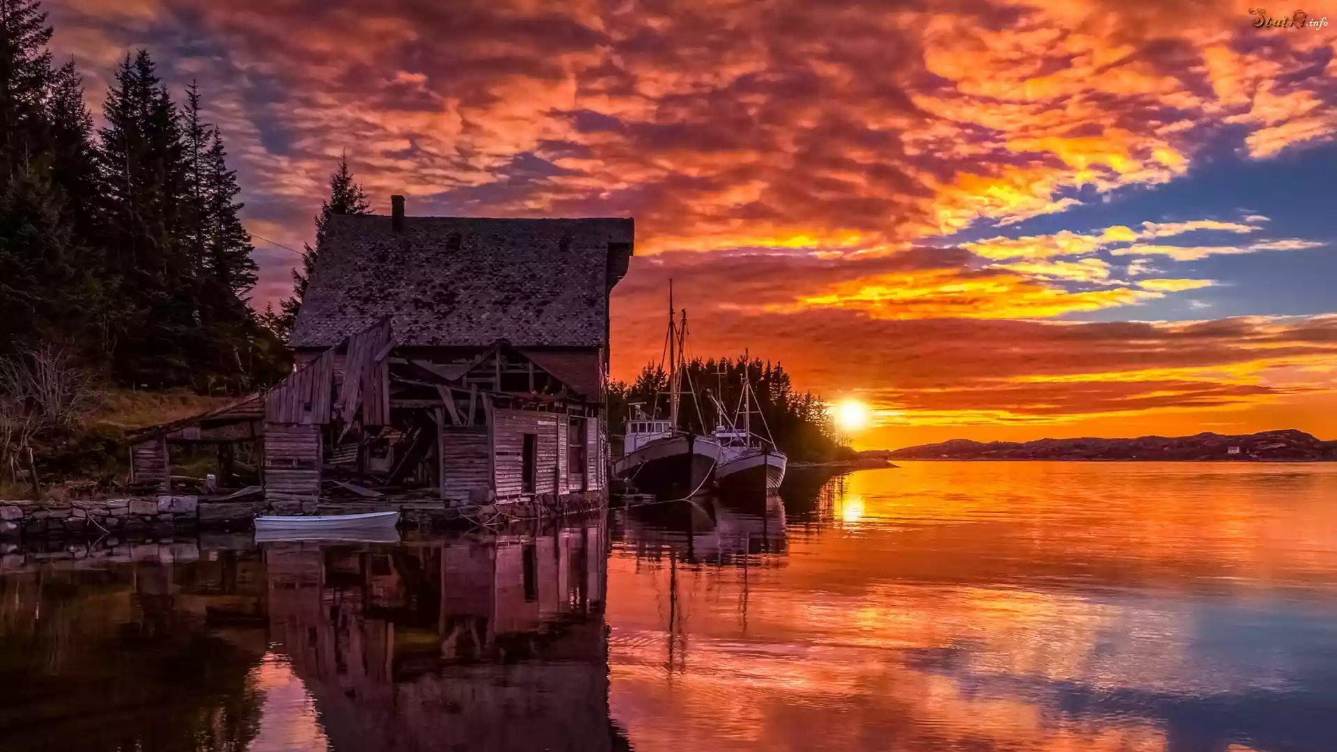 Statek Norwegia, Wyspa Toftøya, Morze Północne, Kutry, Łodzie, Zachód słońca, Dom