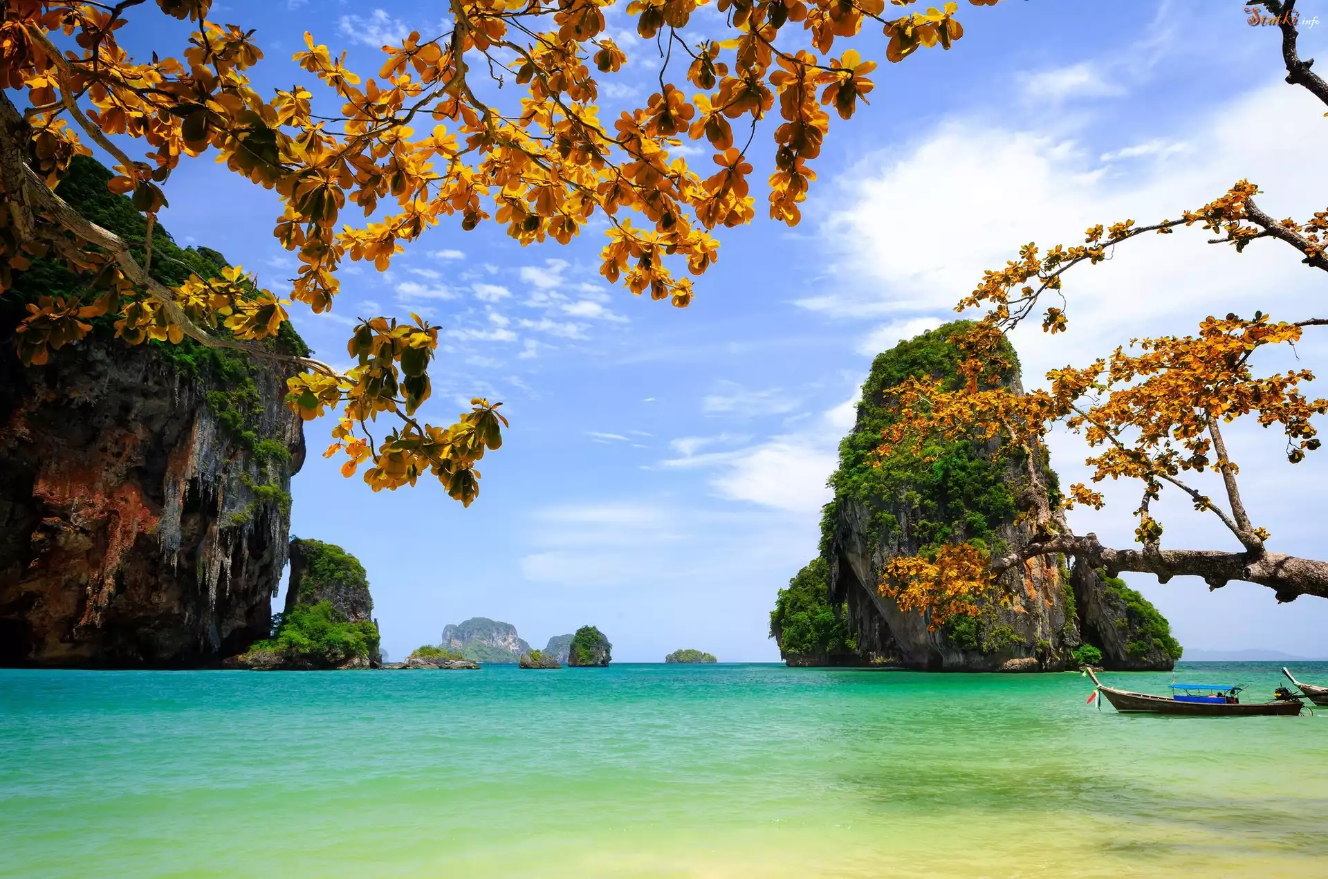 Statek Morze, Skały, Drzewa, Łódki, Jesień