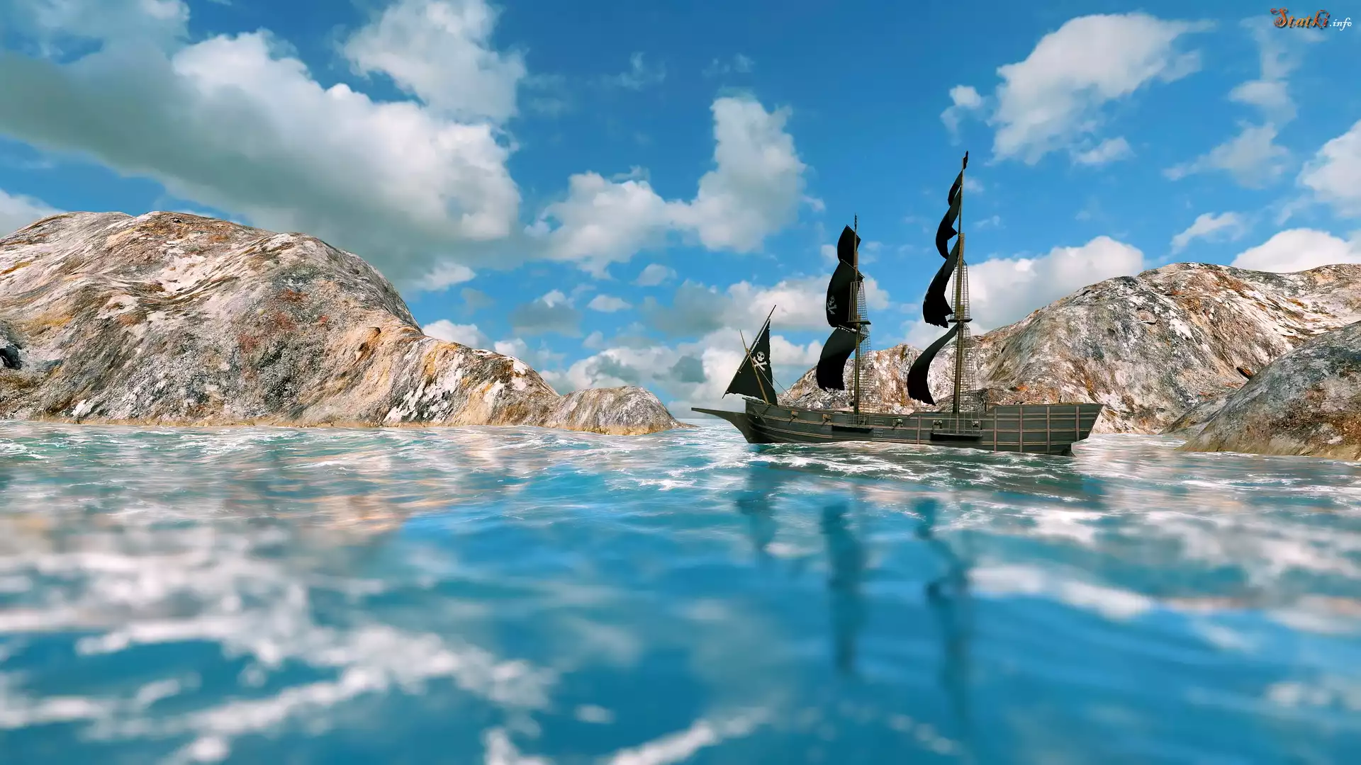 Statek Morze, Skały, Statek, Flaga, Piracka, 2D