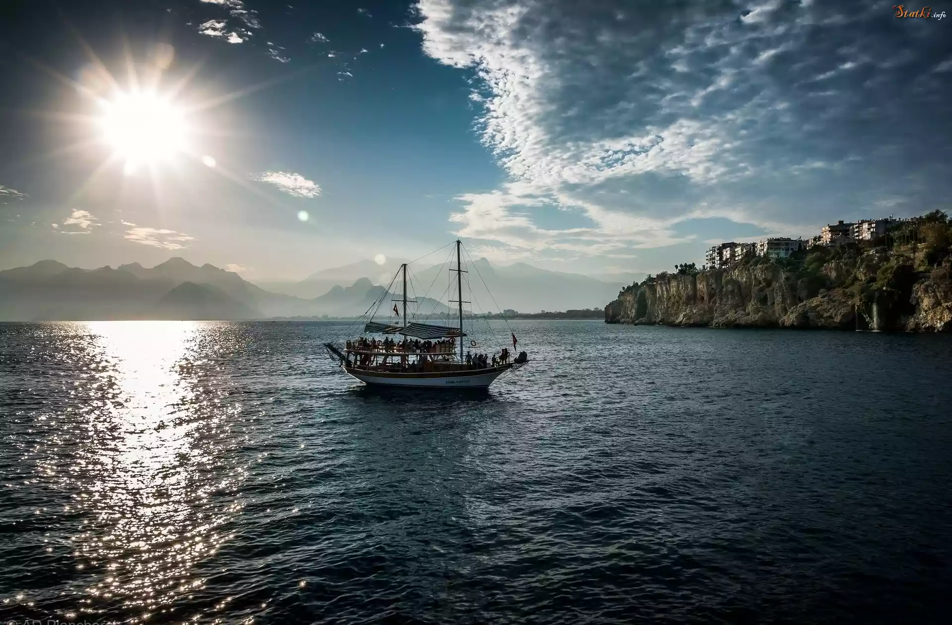 Statek Morze, Skały, Domy, Statek, Promienie, Słońca
