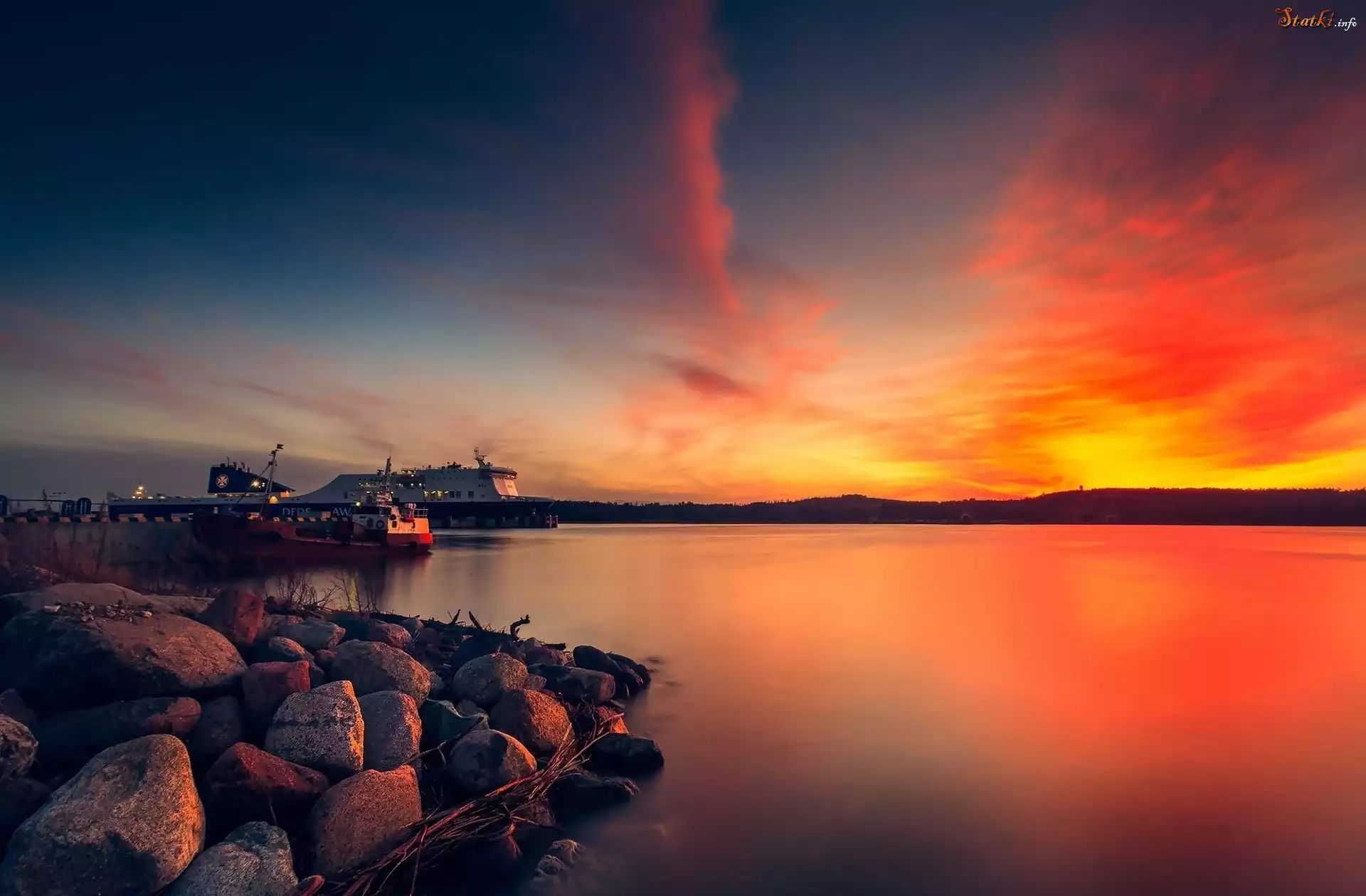 Morze, Kamienie, Zachód, Słońca, Statki