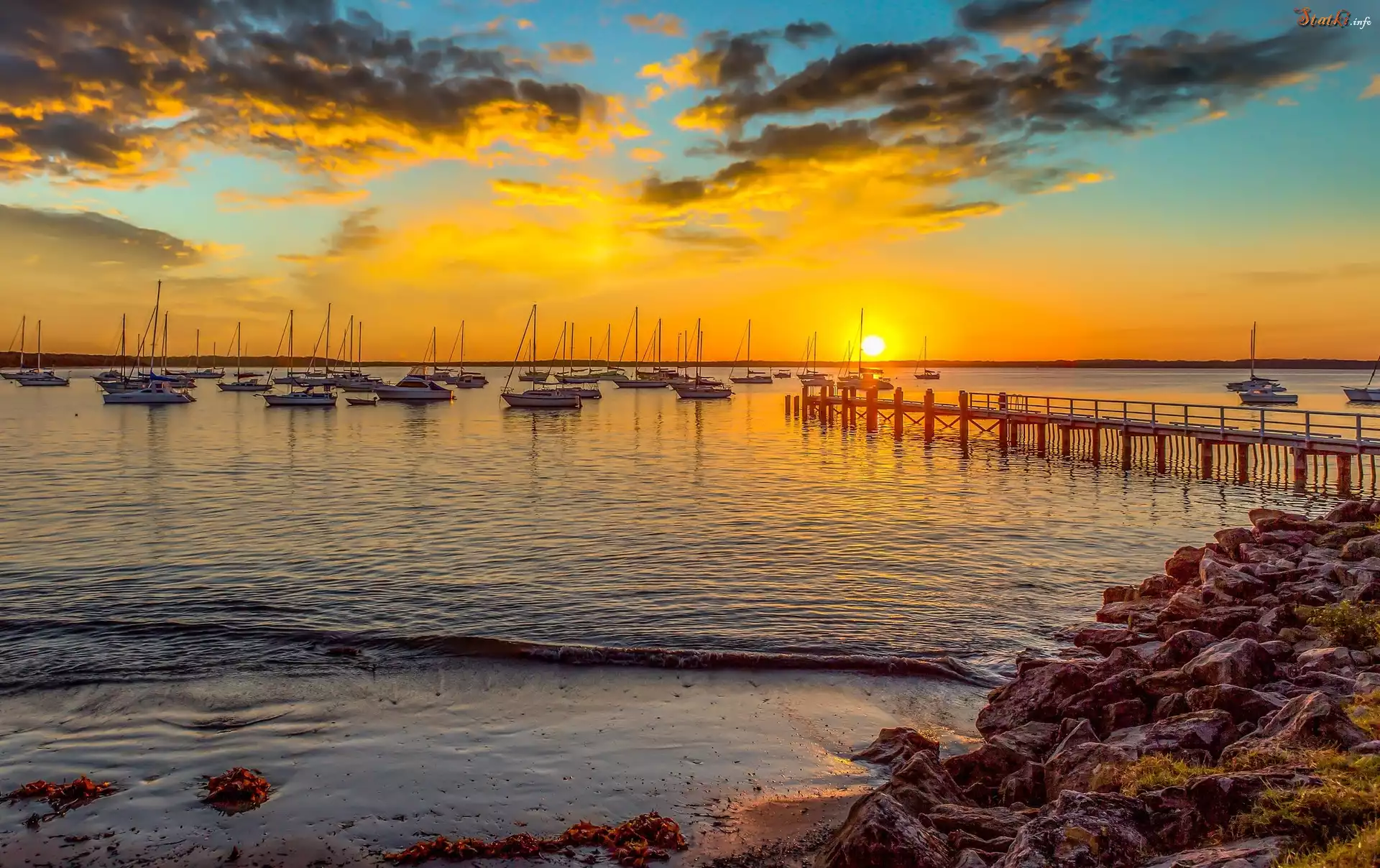Morze, Kamienie, Zachód, Słońca, Statki, Pomost