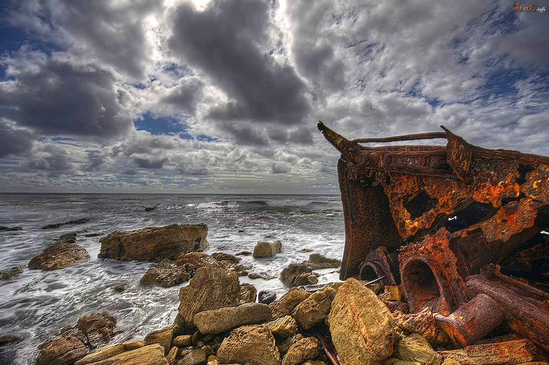 Statek Morze, Skały, Chmury, Wrak, Statku