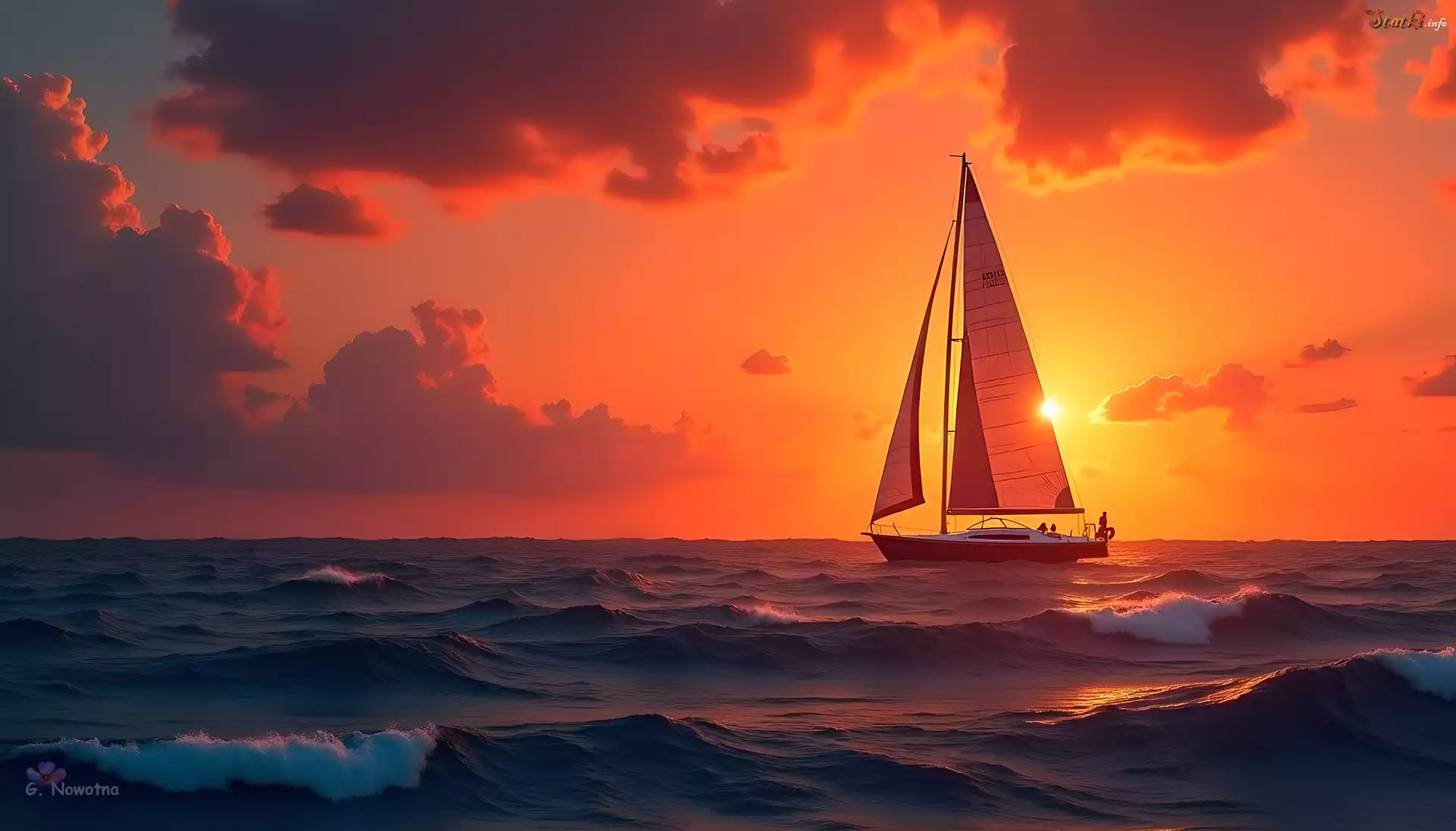 Statek Żaglówka, Morze, Zachód słońca, Grafika