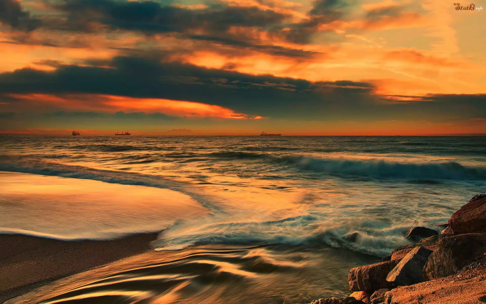 Morze, Fale, Skały, Statki, Zachód, Słońca