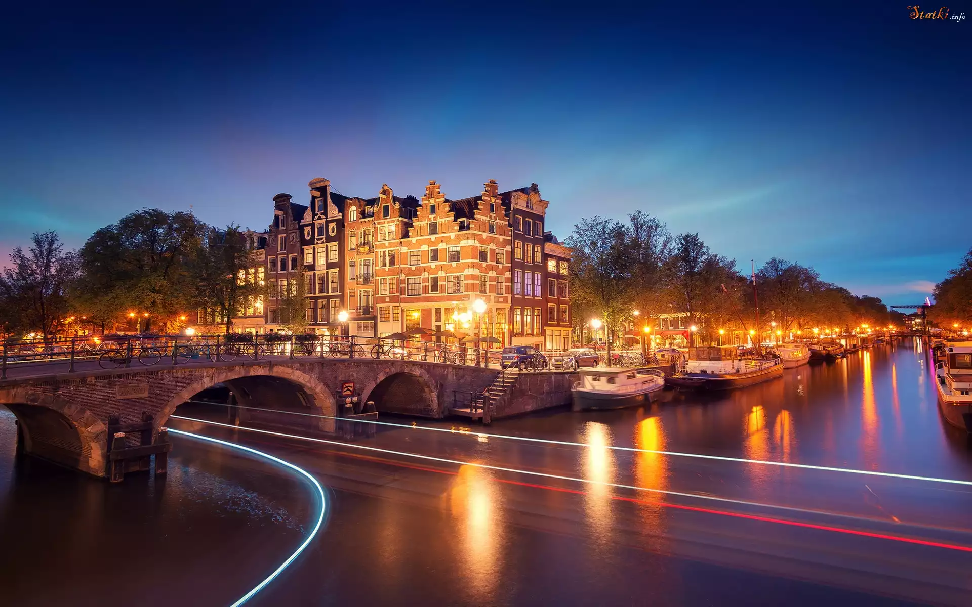 Statek Rzeka, Most, Budynki, Łodzie, Barki, Amsterdam, Holandia, Noc