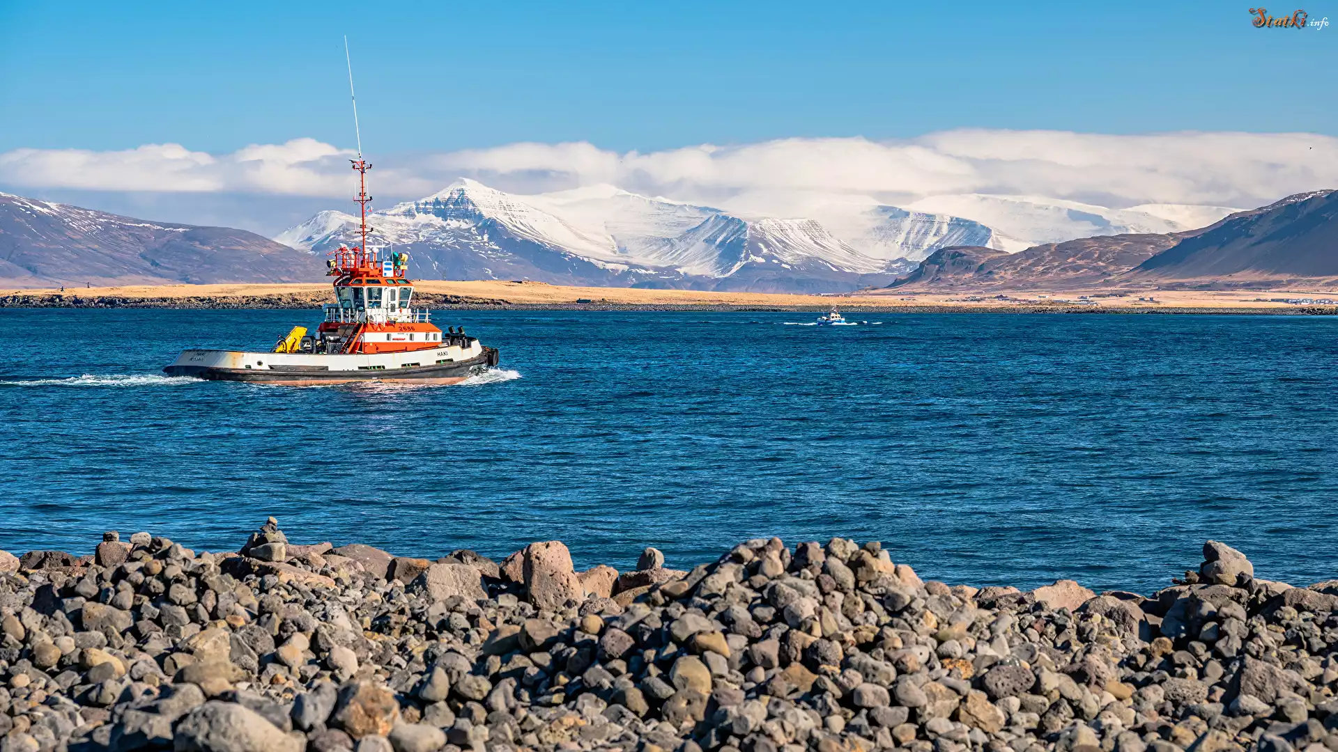 Statek Ośnieżone, Góry, Morze, Motorówka, Kamienisty, Brzeg