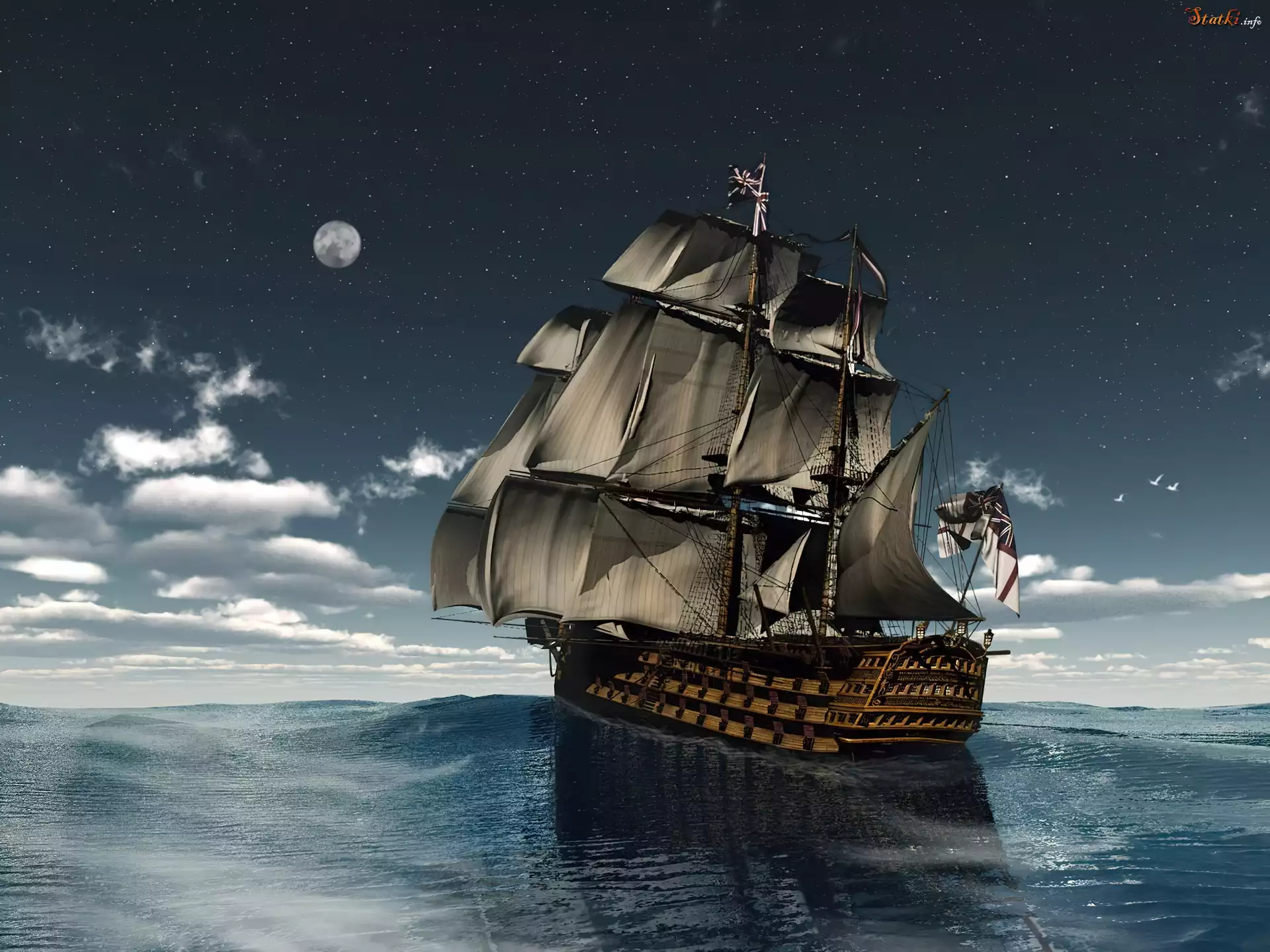 Żaglowiec, HMS Victory, Morze, Noc, Księżyc