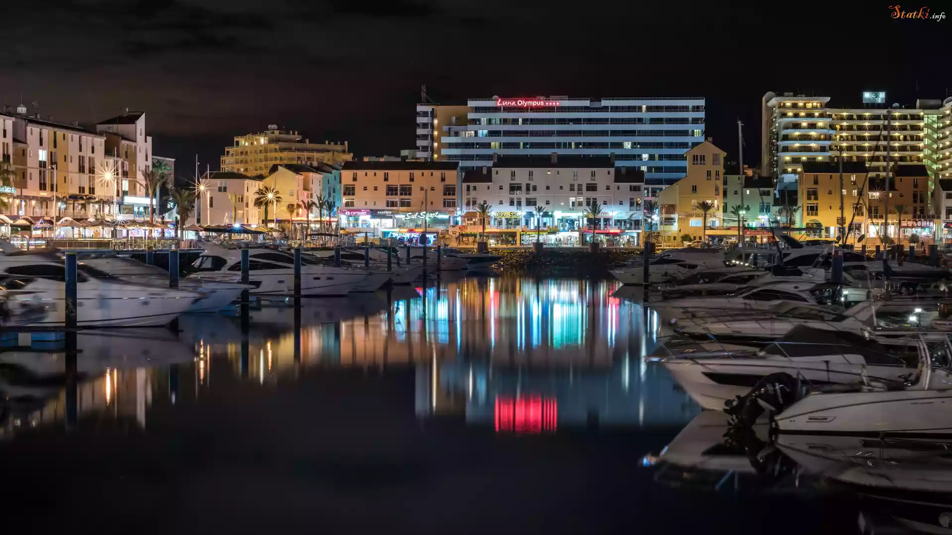 Noc, Światła, Miasto, Domy, Motorówki, Przystań