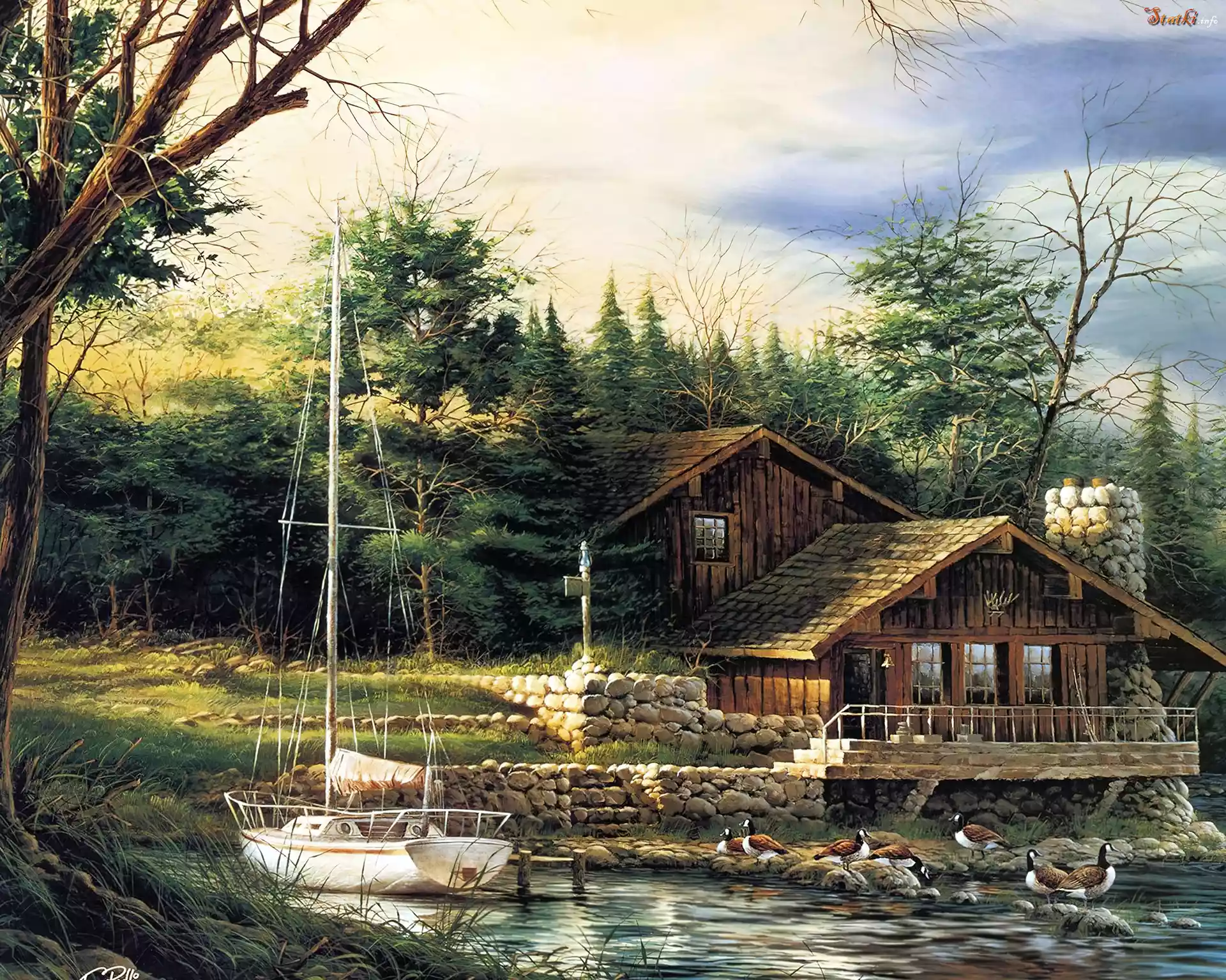 Obraz, Posiadłość, Dom, Jezioro, Żaglówka, Kaczki