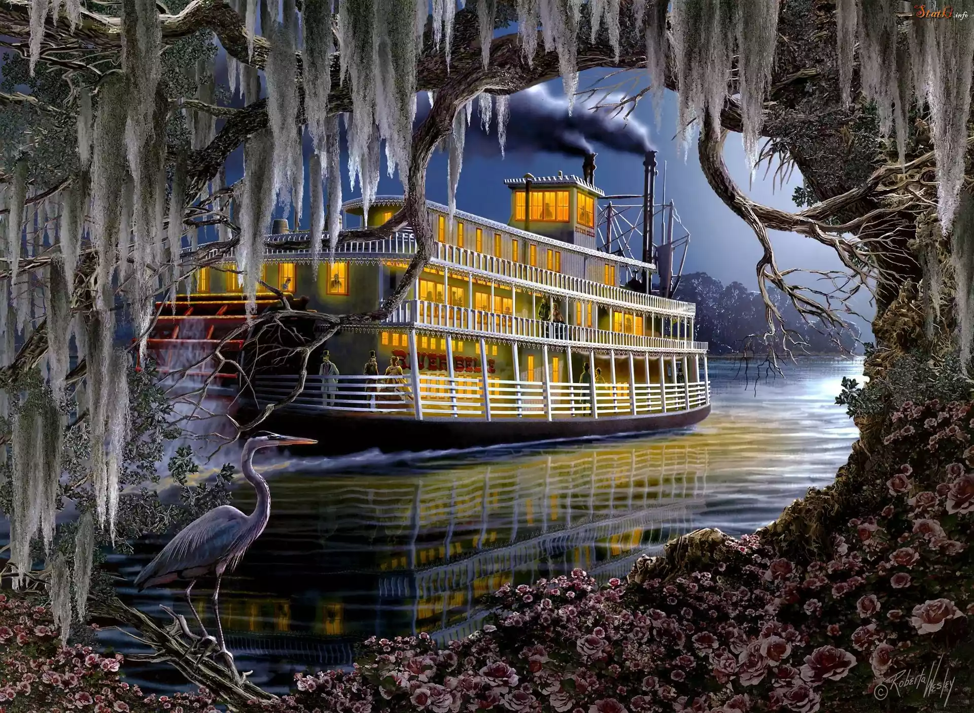 Obraz, Statek, Drzewo, Ptak, Woda