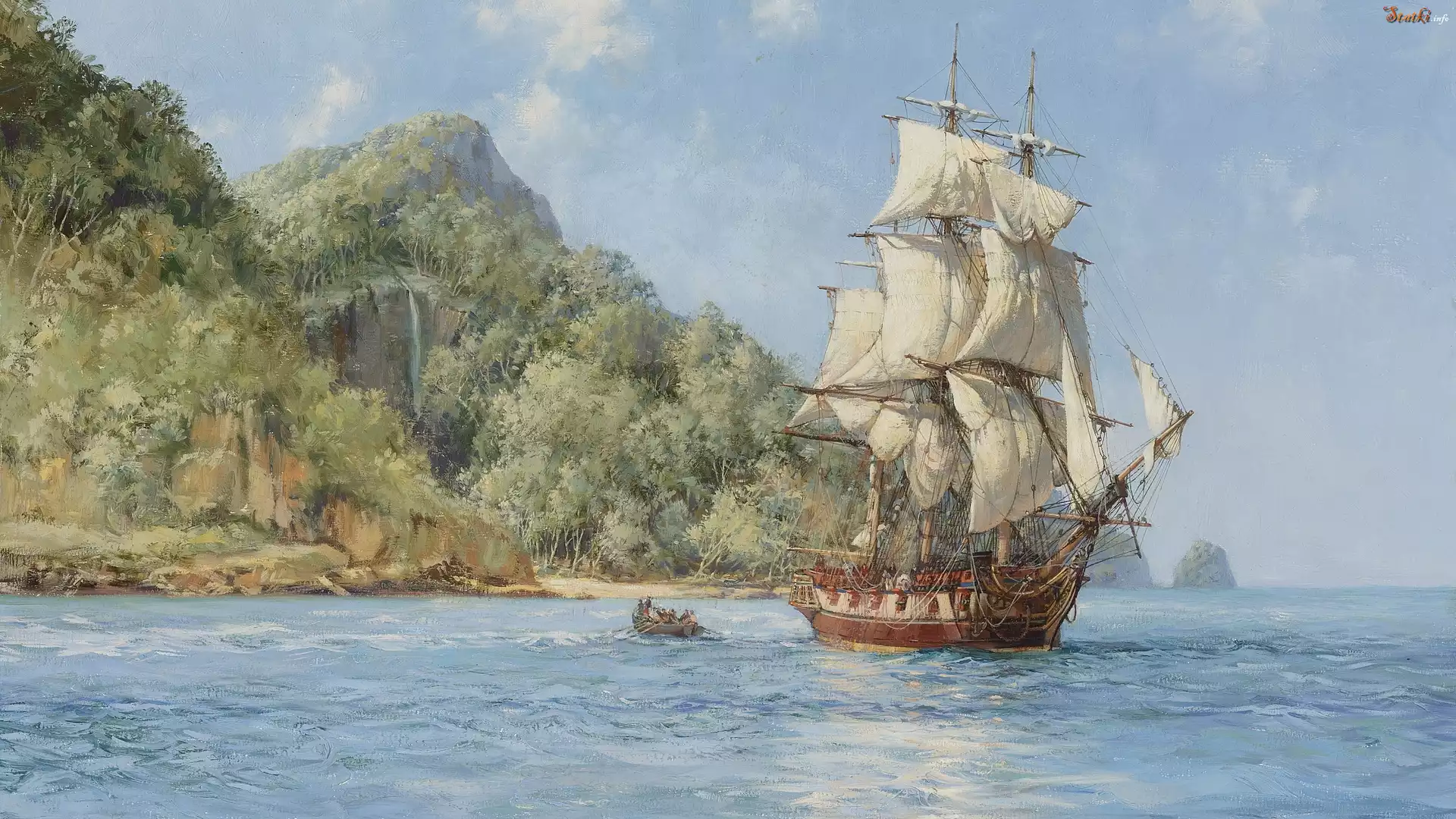 Statek Malarstwo, Obraz, Montague Dawson, Żaglowiec, Morze, Skały, Roślinność