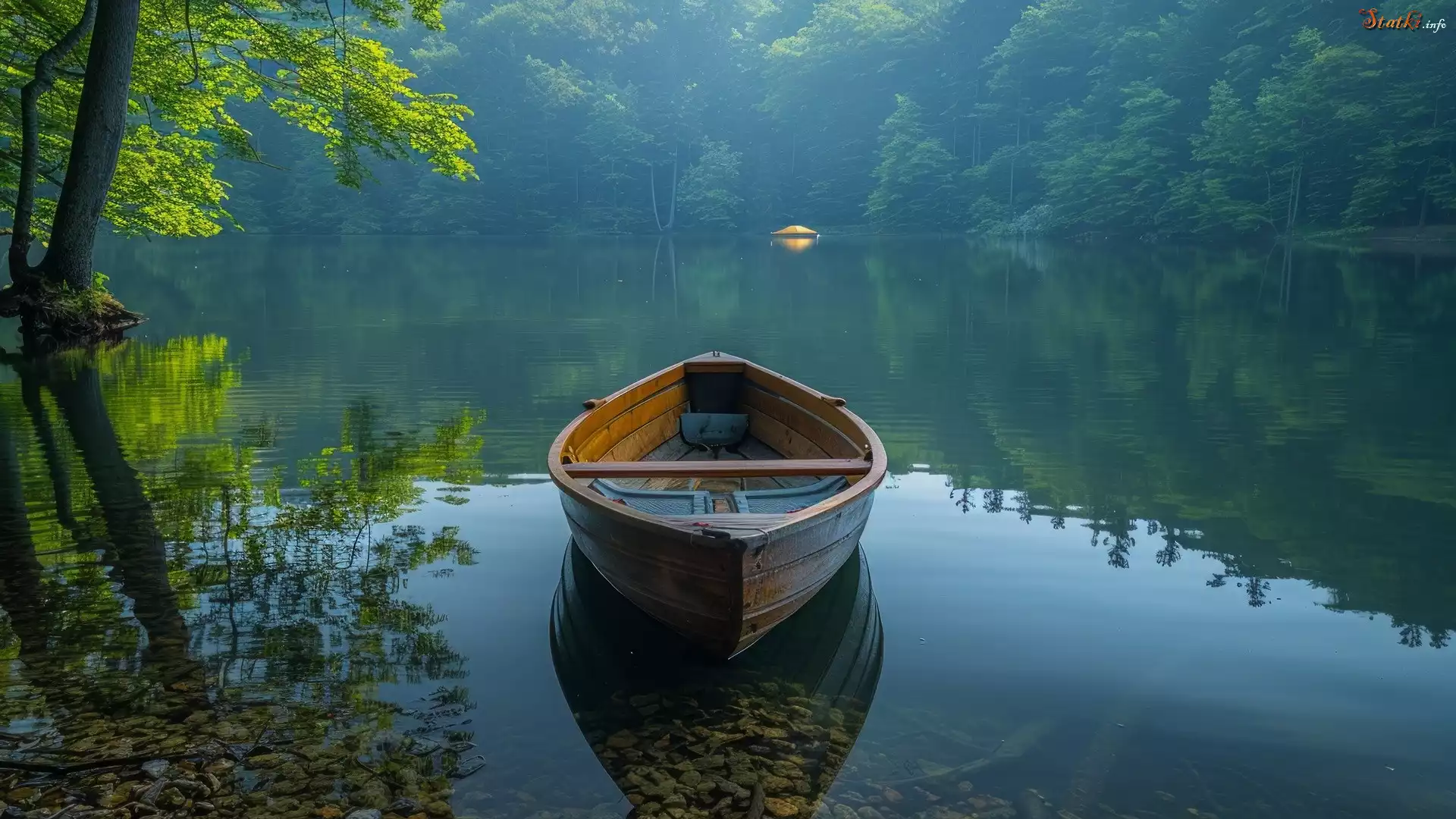 Statek Jezioro, Łódka, Drzewa, Odbicie