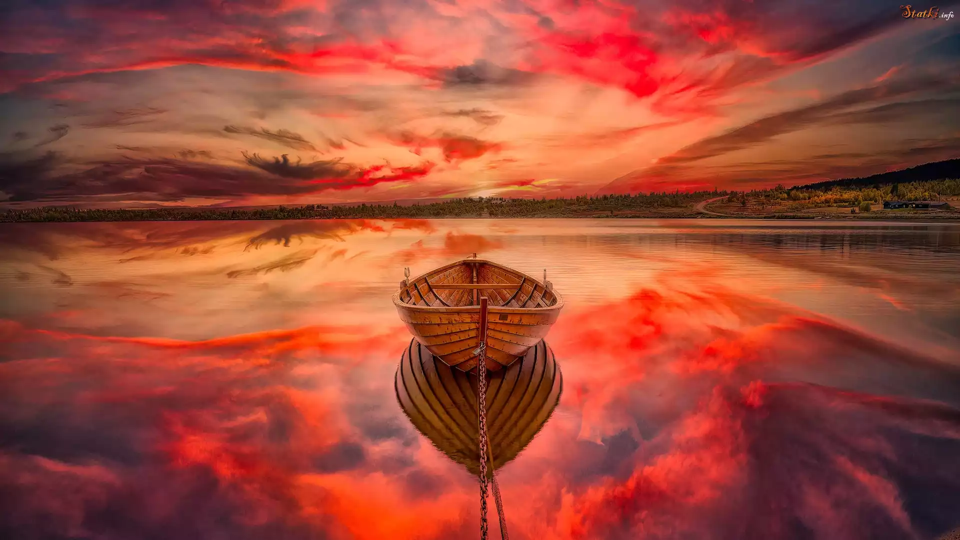 Statek Jezioro, Łódka, Niebo, Odbicie, Zachód słońca
