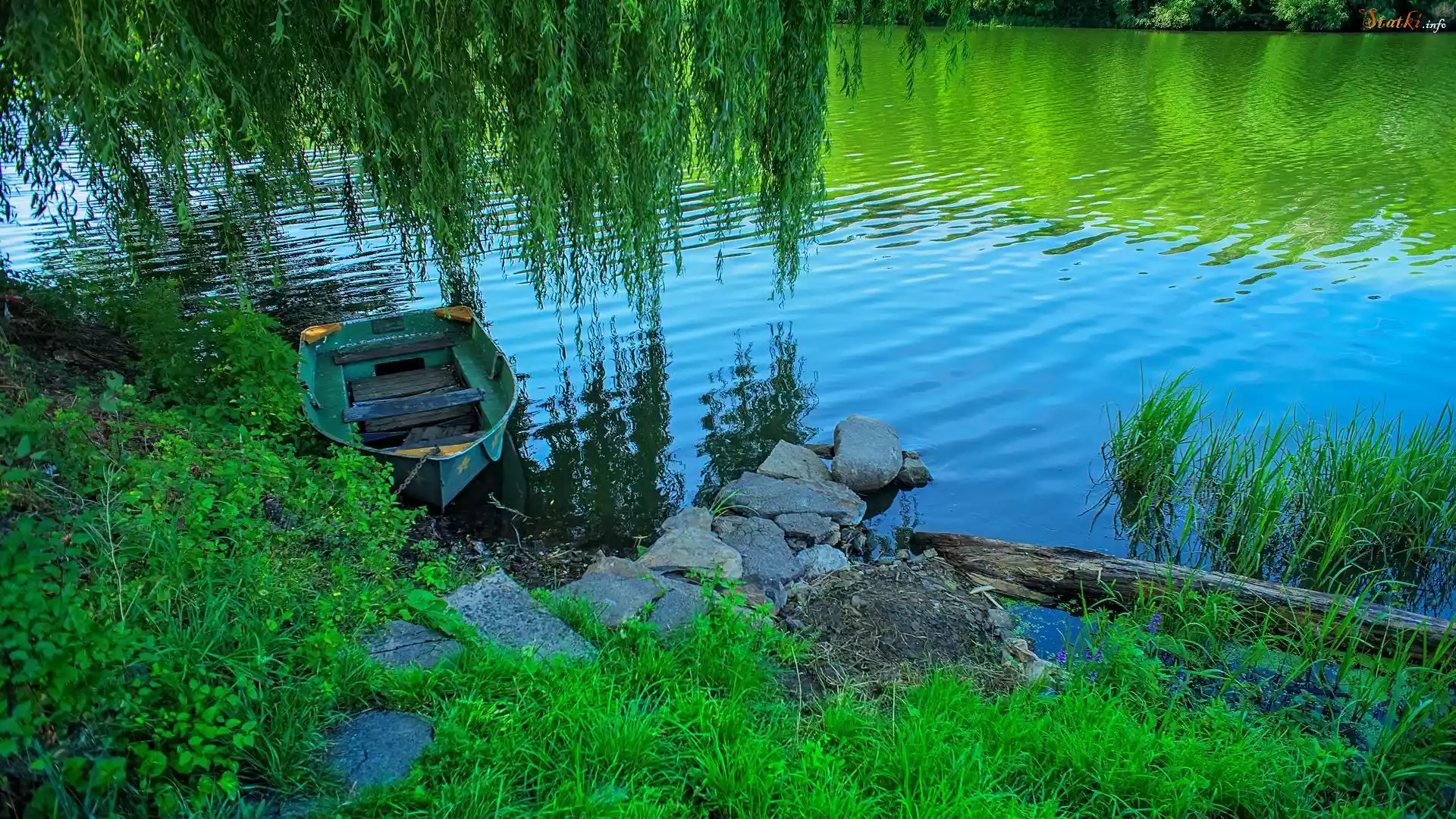 Łódka, Wierzba płacząca, Rzeka, Kamienie, Roślinność