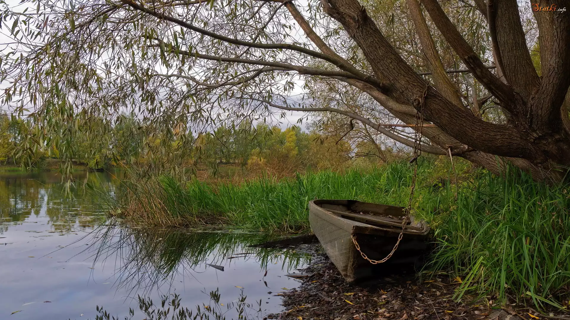 Statek Łódka, Brzeg, Jezioro, Szuwary, Drzewo, Wierzba