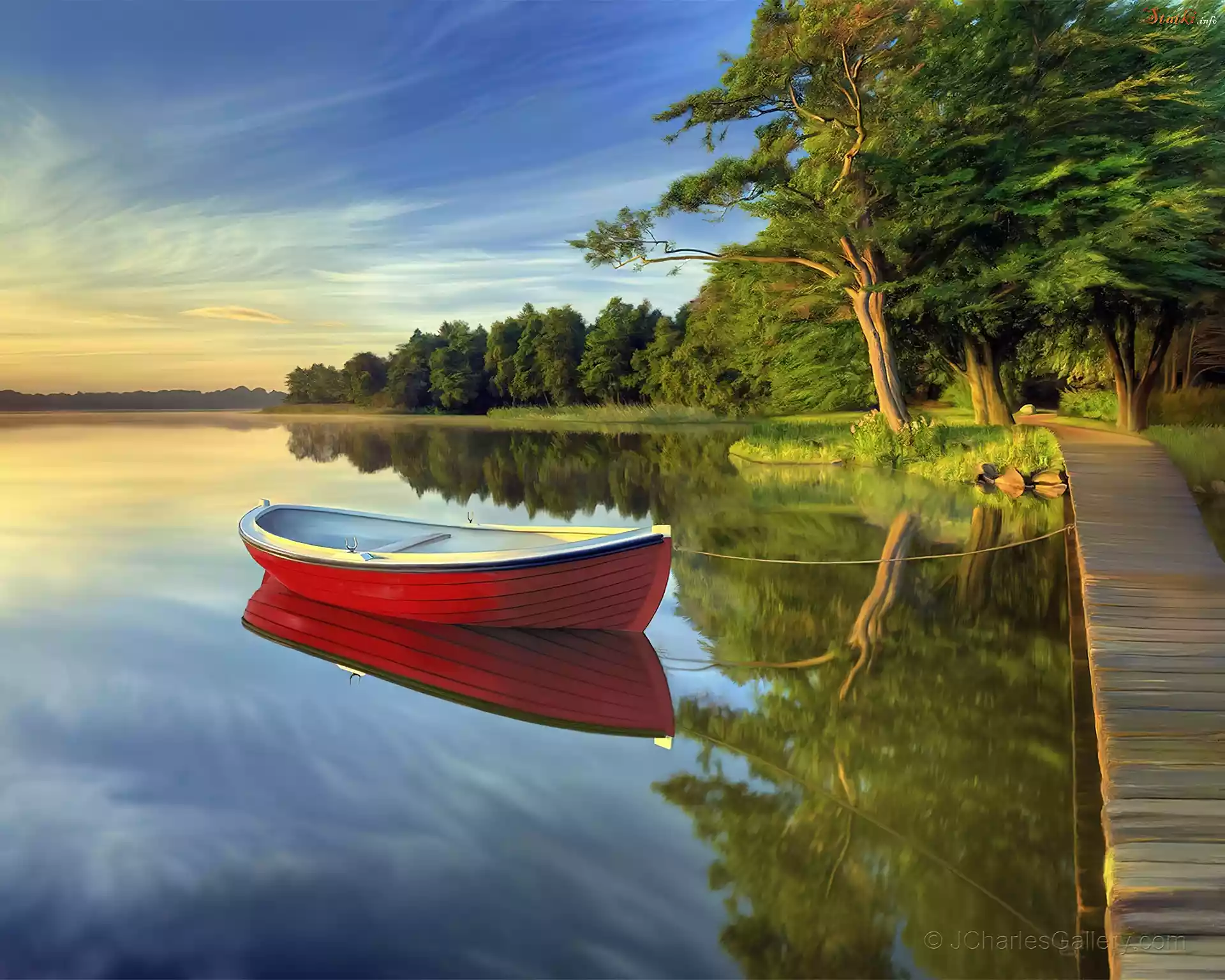 Czerwona, Łódka, Jezioro, Drewniany, Mostek, Drzewa, Odbicie