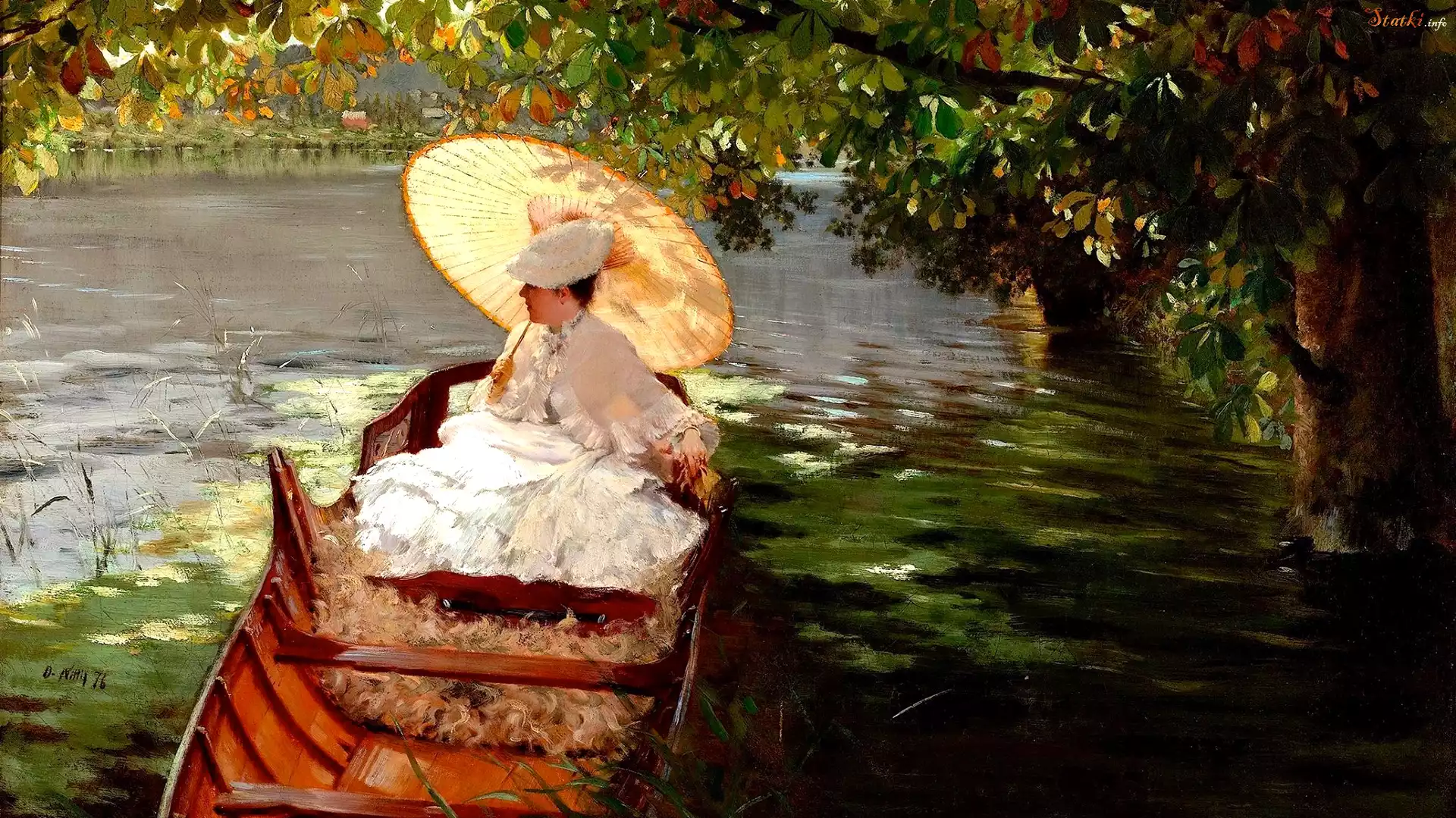Malarstwo, Giuseppe de Nittis, Kobieta, Parasol, Jezioro, Drzewo, Łódka