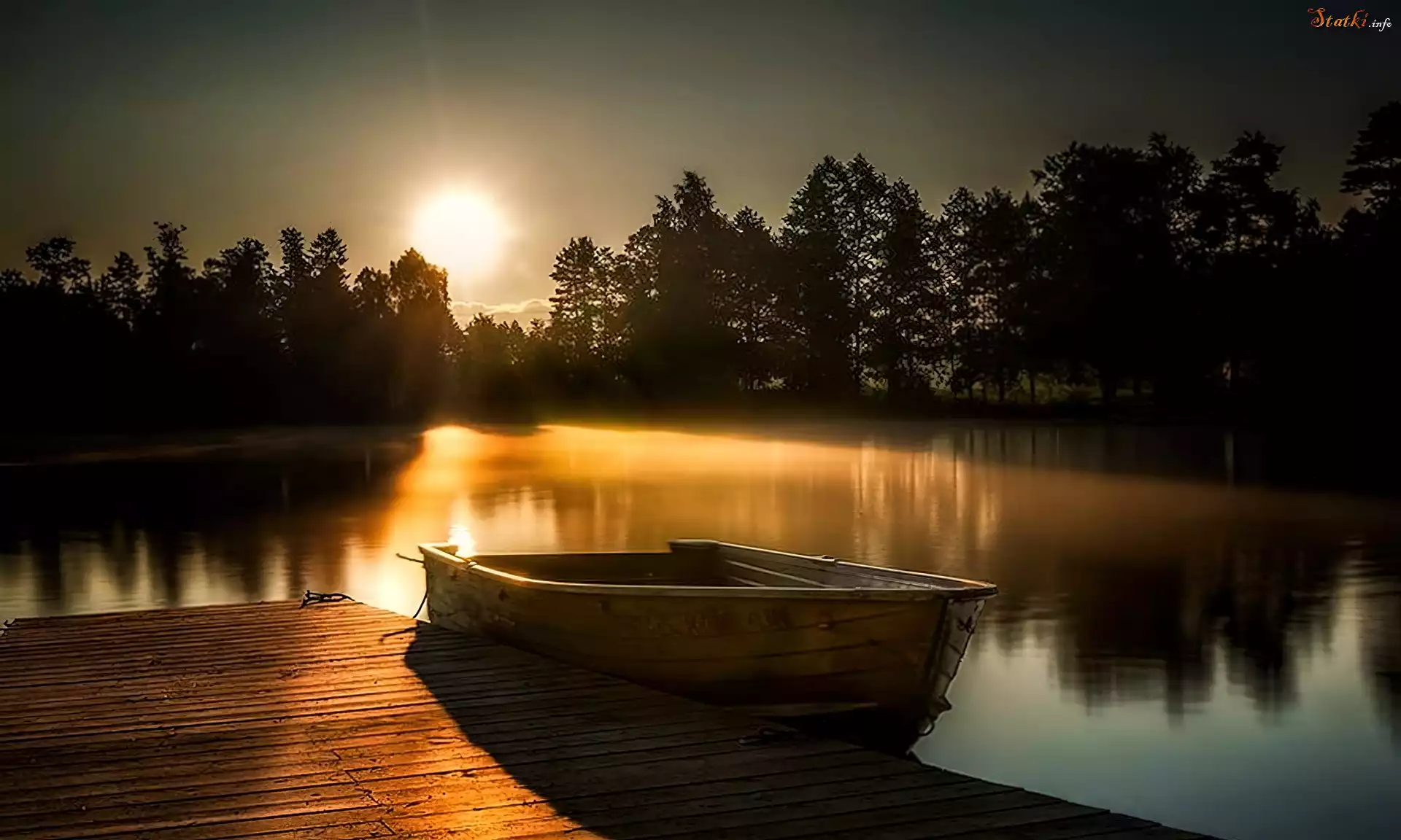 Statek Łódka, Pomost, Jezioro, Drzewa, Wschodzące, Słońce, Odbicie