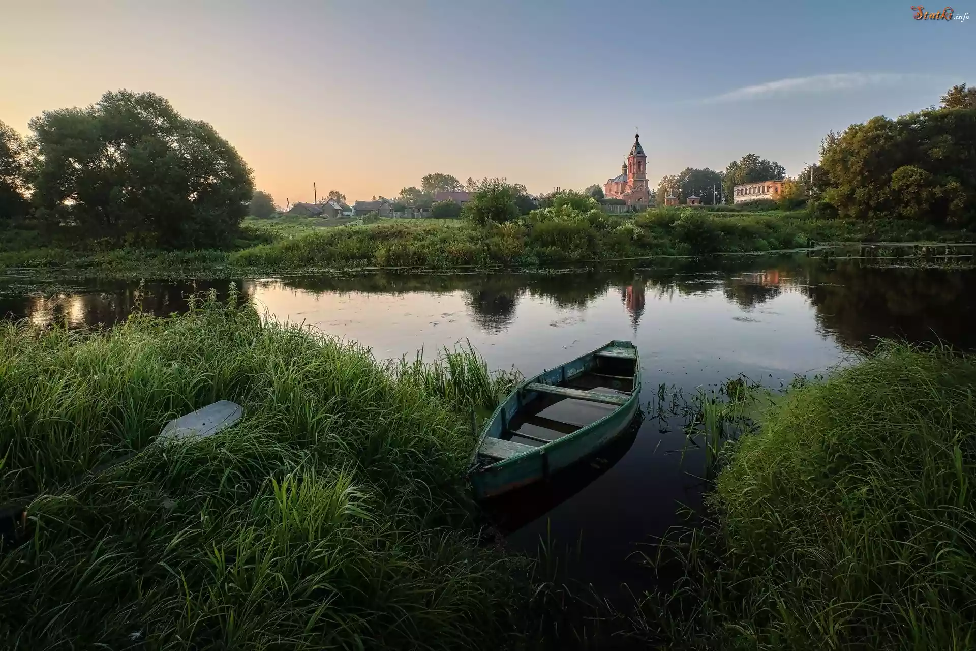 Rzeka, Łódka, Trawa, Kościół, Domy, Drzewa, Wioska
