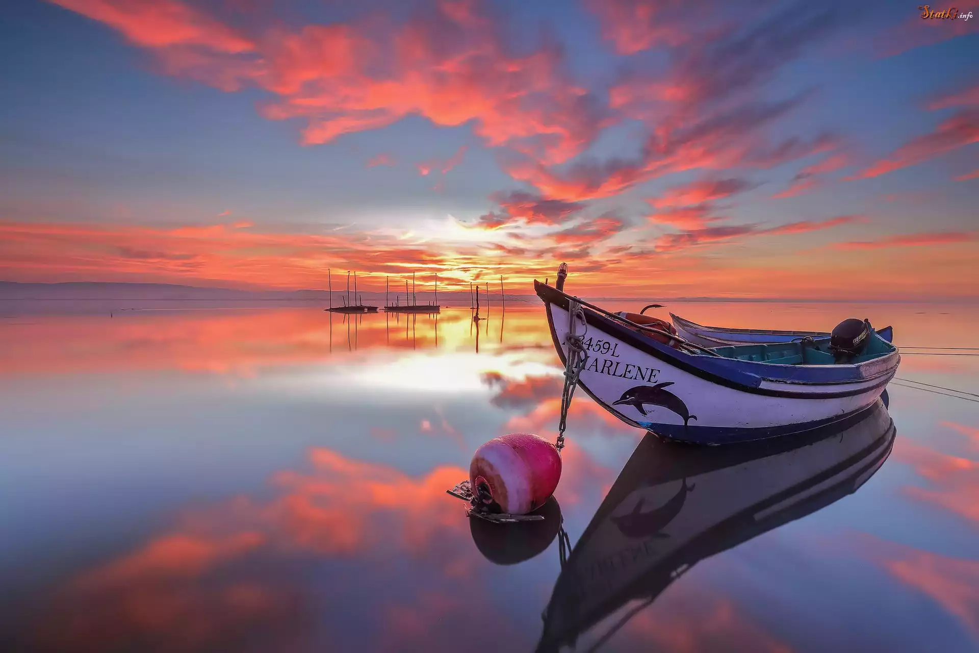 Statek Łódka, Jezioro, Niebo, Chmury, Odbicie, Wschód słońca