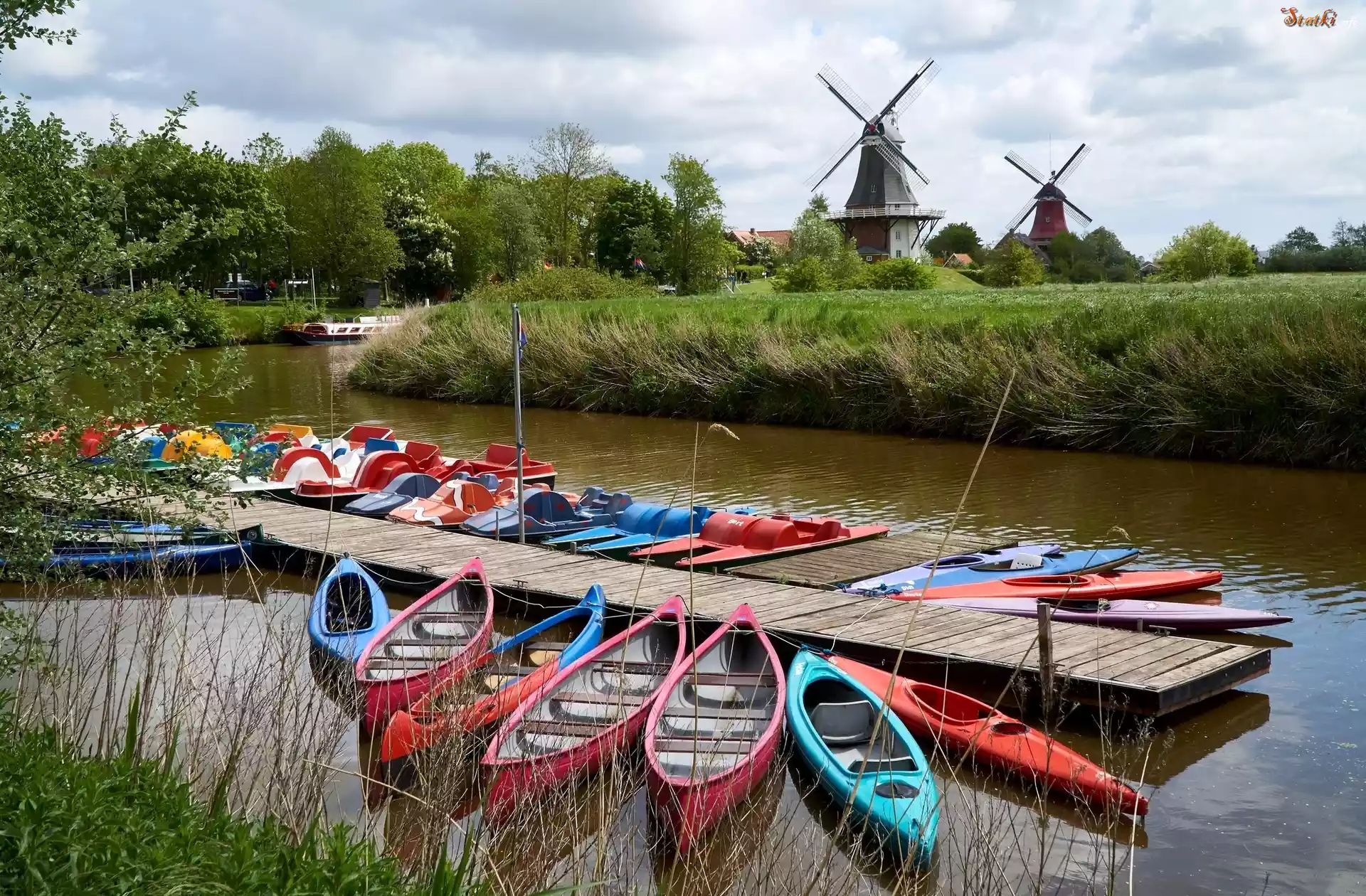 Rzeka, Łódki, Rowery, Wodne, Wiatraki, Drzewa, Roślinność