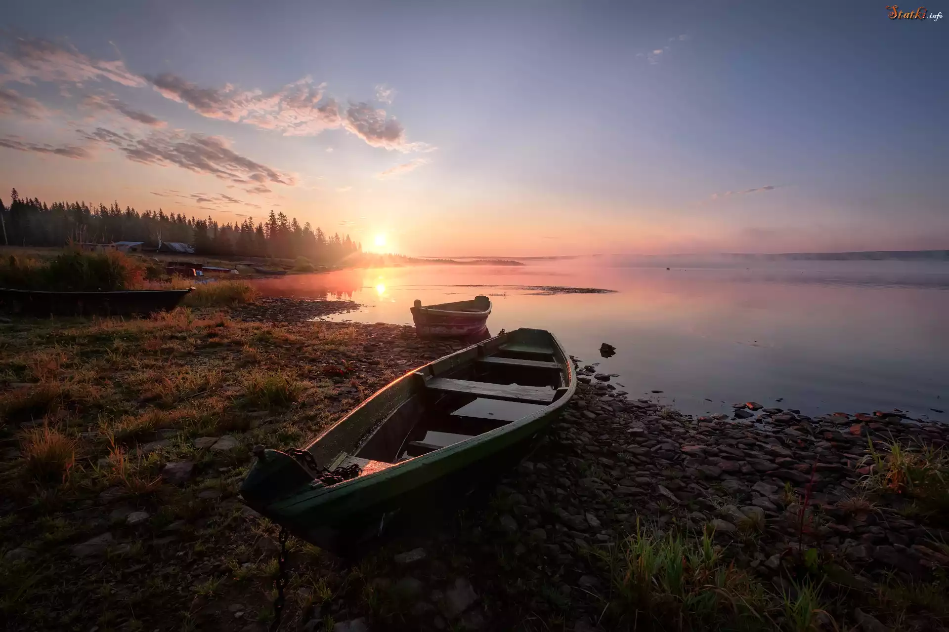 Statek Jezioro Ziuratkul, Łódki, Wschód słońca, Park Narodowy Ziuratkul, Obwód czelabiński, Rosja
