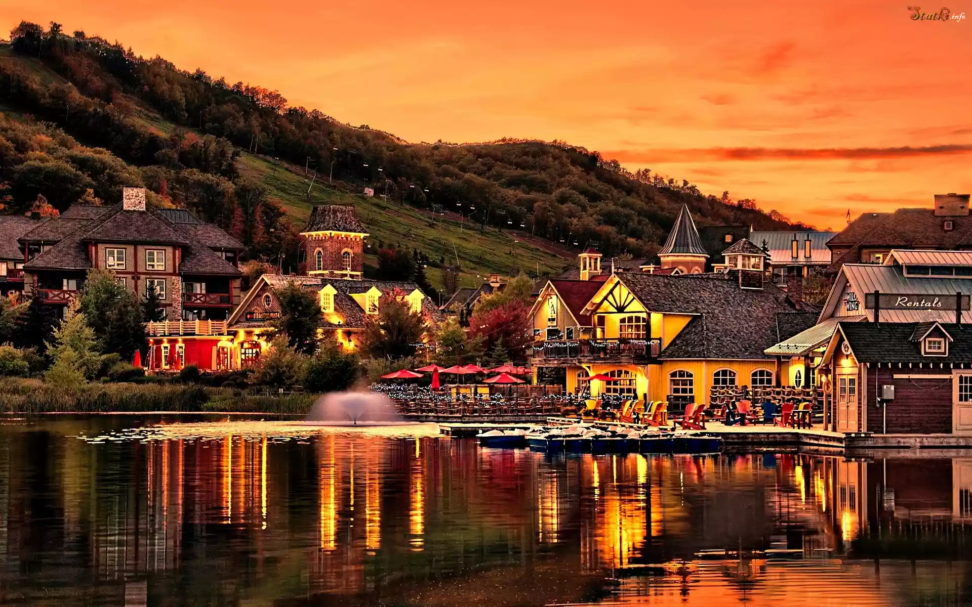 Jezioro, Łódki, Fontanna, Góry, Osada, Turystyczna, Zachód, Słońca