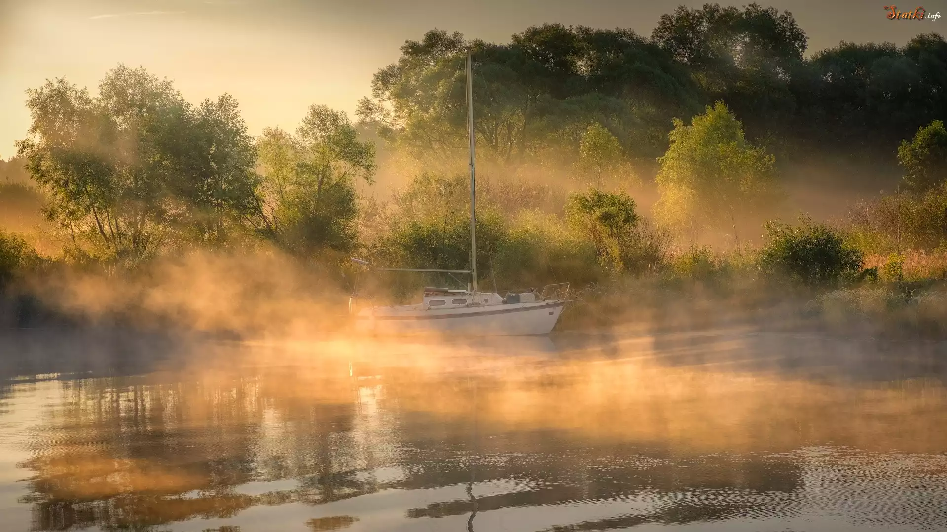 Statek Rzeka, Dubna, Mgła, Przebijające światło, Drzewa, Żaglówka, Łatgalia, Łotwa