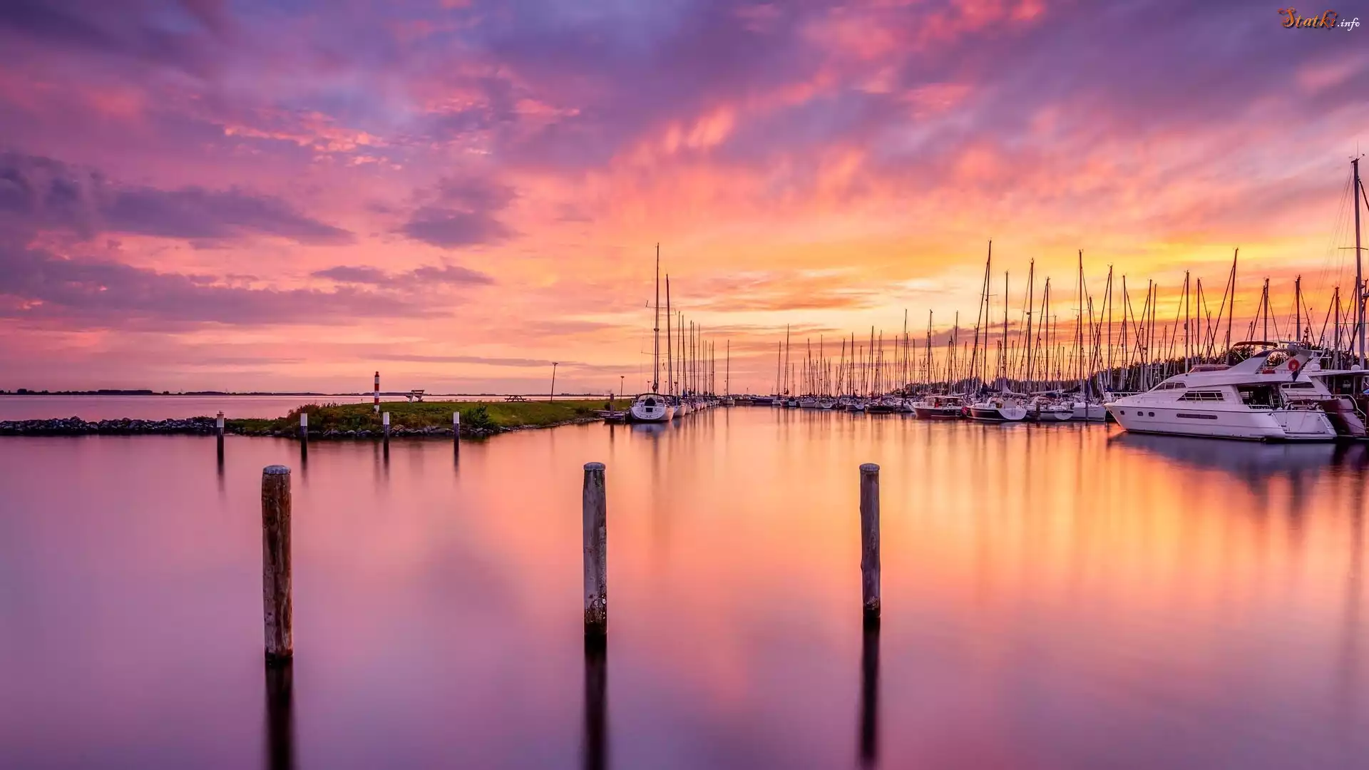 Statek Zachód słońca, Morze, Pale, Przystań, Żaglówki, Jacht