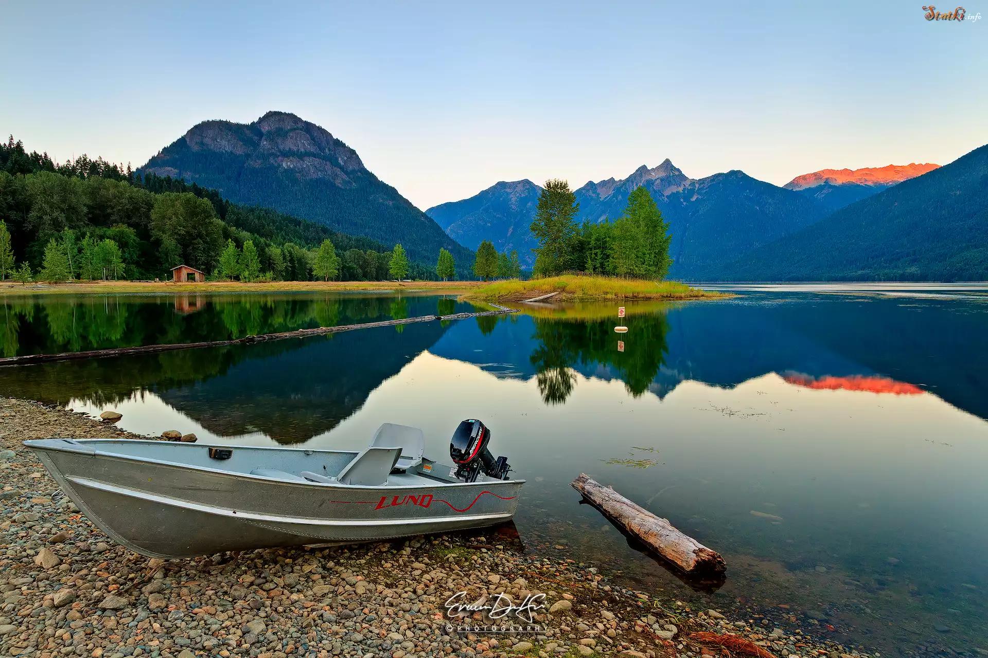Park prowincjonalny Skagit Valley, Góry, Jezioro Ross, Las, Drzewa, Motorówka, Kolumbia Brytyjska, Kanada |
