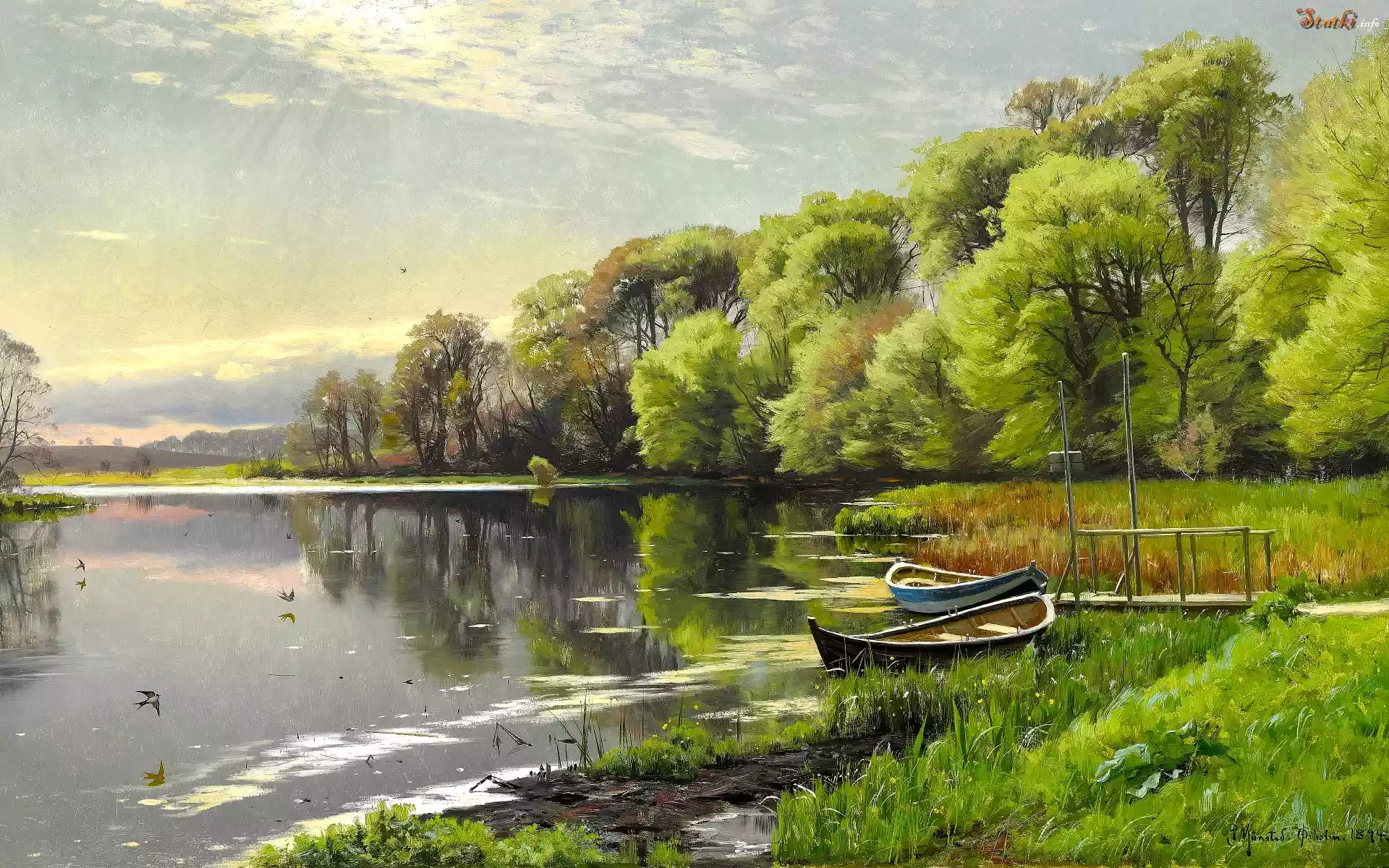 Statek Obraz, Malarstwo, Peder Mork Monsted, Rzeka, Zarośla, Szuwary, Drzewa, Łódki, Pomost