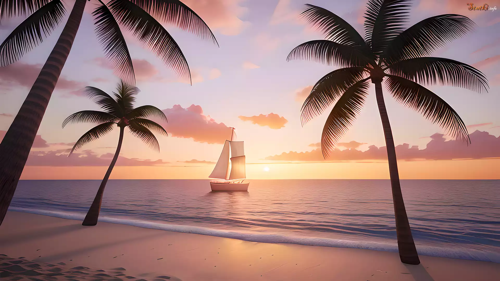 Statek Morze, Plaża, Palmy, Żaglówka, Grafika