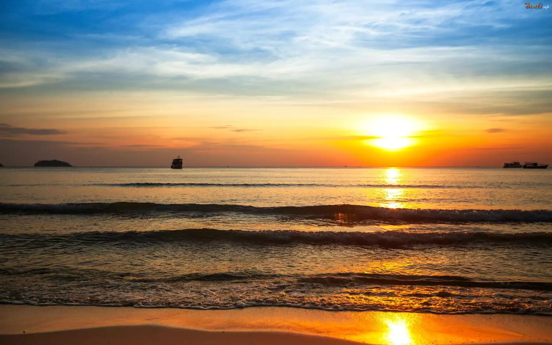 Statek Plaża, Morze, Fale, Statki, Zachód, Słońca