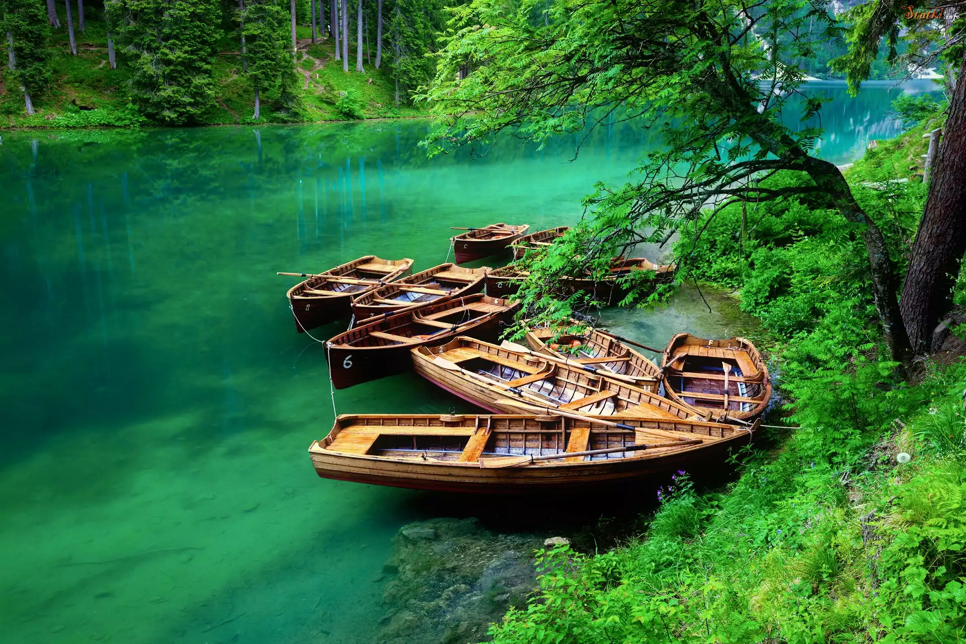 Statek Włochy, Południowy Tyrol, Jezioro Pragser Wildsee, Łódki, Las