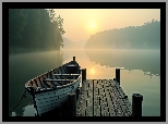 Statek Jezioro, Pomost, Łódka, Mgła, Poranek