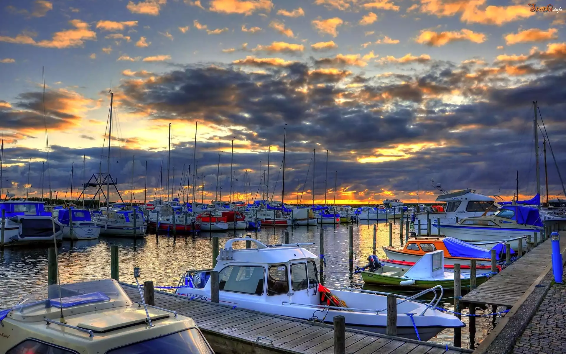Port, Zachód, Słońca, Jachty, Motorówki, Łódki