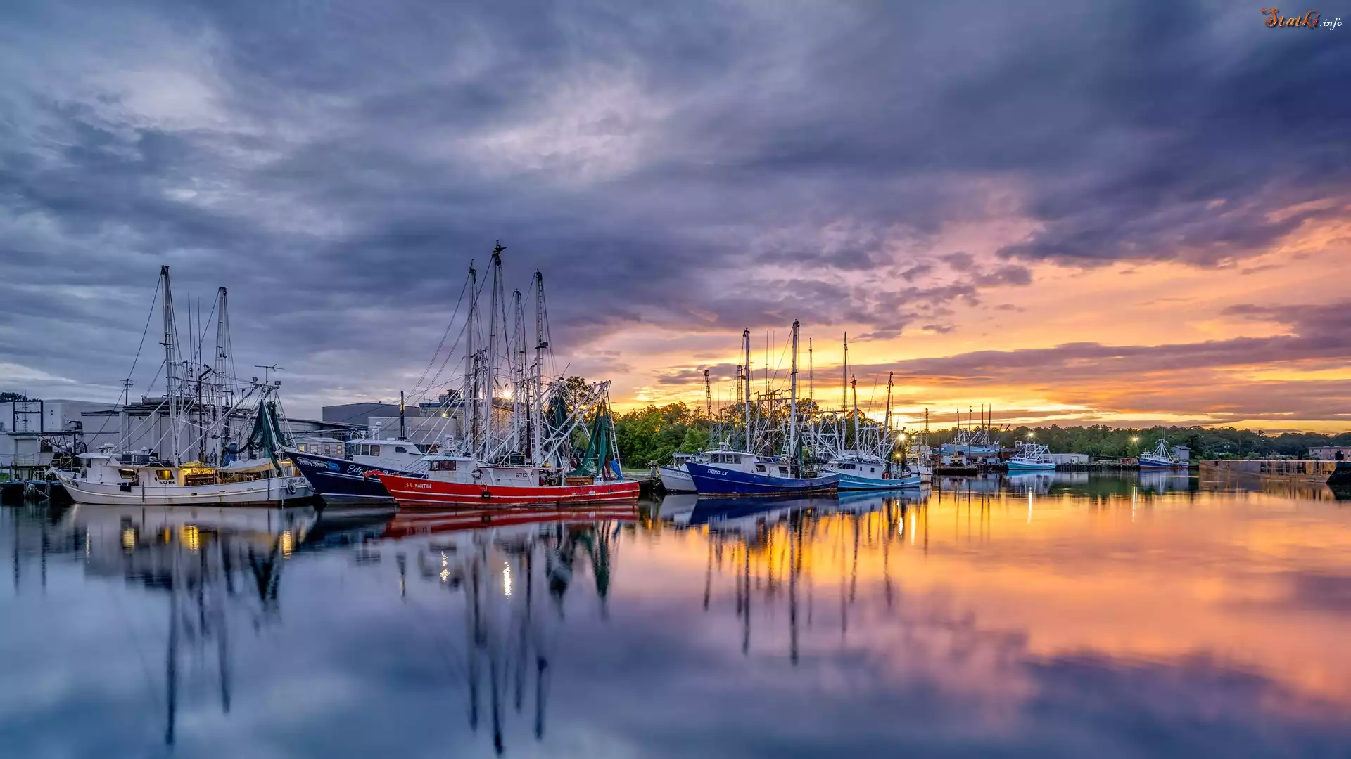 Statek Port, Żaglówki, Drzewa, Zachód słońca, Chmury